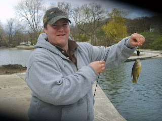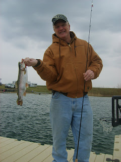 They caught 2 walleye, 9 trout, and 7 largemouth bass fishing off of the dock. Just kicked back and had a great time! Blue Fox spinner turned out to be the hot bait for the day. Here is a pic of Bobby with his first trout of the day: