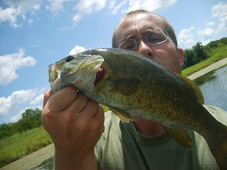 Then we quickly finished setting a dock that Rodger and co had built and hit the boat with an assortment of plastic tubes and jigs. I figured since is was the middle of the day and sunny that the smallies would be hanging along the deep edge of the pond, and boy was I wrong for the first 30 minutes. I didnt even get a nibble! Then as I was starting to get desperate to show off my fish catching capabilities and live up to my fish catching reputation I saw and heard a smallie slam a dragon fly on the other side of the pond!!!