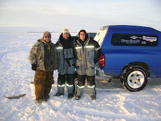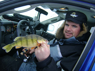 Anyhow, we scarfed down a whole bunch of bacon, eggs, and potatoes and hit the road. Even though the lake is right out in front of the lodge, our fishing destination usually is like 15-30 miles away. Just picture a lake so large that it stretches from Peoria to Bloomington! Today we were fishing with one of Devils Lakes most famous multi-species fishing guides Jason Mitchell. His line of ice fishing rods is pretty awesome!