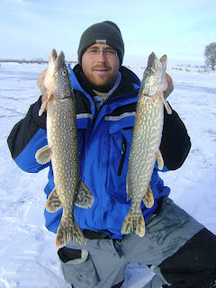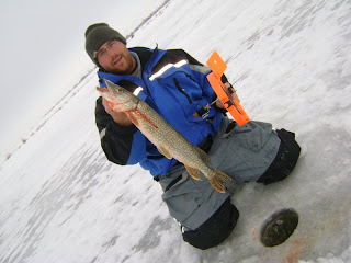 His adrenaline was pumping and we were all hooting and hollering and there was just enough excitement going on to kind of cover up the lack of fight the fish had, but when he pulled it up through the hole and saw it flop motionless onto the ice he was somewhat confused for just a split second. Then when he saw the old blood on the fish he finally put it all together and let out the loudest Ooooooh Maaaaan you can feasibly imagine. His reaction was priceless, I am telling you his excitement was so great building up to this, and his disappointment at not legitimately catching a pike combined with the fact he just got majorly duped was just about enough to stop his heart from beating. Ask him about it, but make sure you have about 10 minutes of free time to hear the story plus a few other stories when you do. It took several minutes before being able to talk him into this photo: