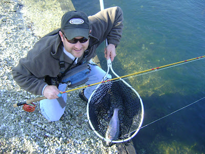 Today I took Brad and Dick out fishing. They were part of a group trip with Jamie. The weather didn't look like it was going to be in our favor, but it ended up holding off almost all day. During lunch we had to take refuge and get out of the storm, but other than that the sun tried to poke out all day! The water was high but the fish were on fire! We caught alot of great rainbows today. The largest was 6 1/2 pounds! The boys did good and turned many a slab today. It was the kind of day that just makes me so glad to call this river my home waters!