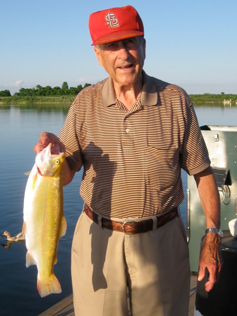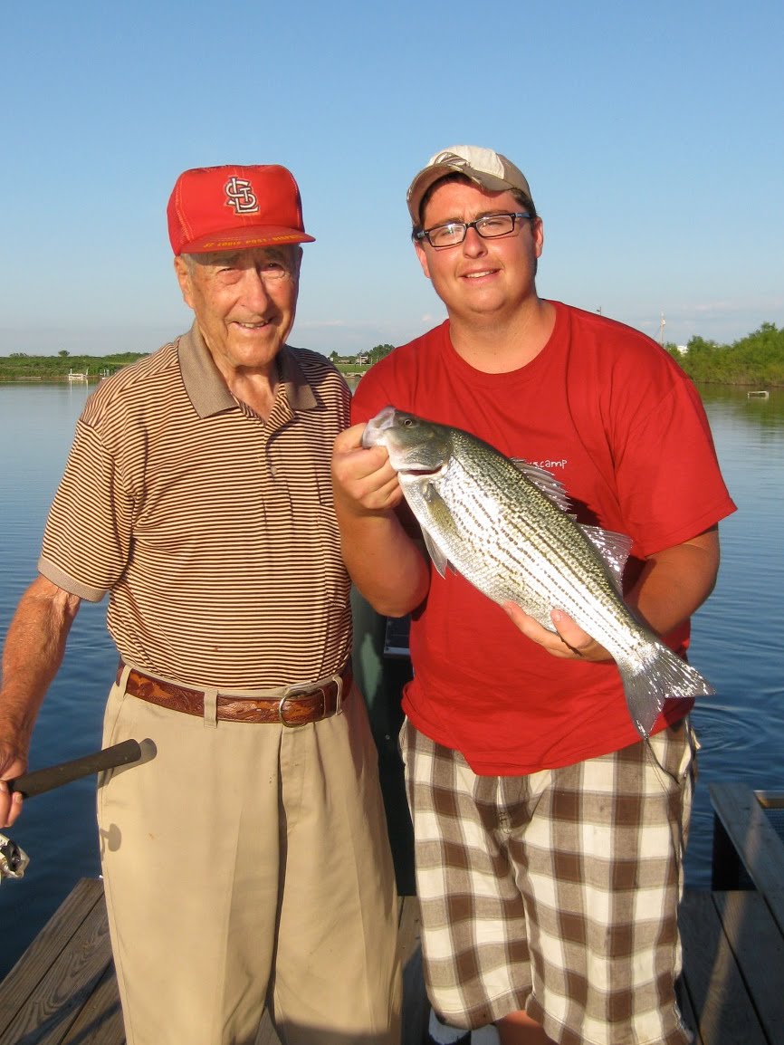 On Sunday Justin took out his grandpa fishing for just a few minutes. It was hot, the lake was still stirred up pretty good from boys camp on saturday and a whole slew of people on sunday, but they managed to catch a couple real nice fish. With just a couple casts from our VIP dock they were able to get a nice hybrid striped bass and a nice golden trout for dinner. We named the dock the VIP dock, because the only people allowed to ever fish from the dock are quite frankly VIP. Justin's grandpa by marriage, a life long fisherman, but first timer out to Norris definitely qualifies as a VIP. Here are a couple pics to remember forever: