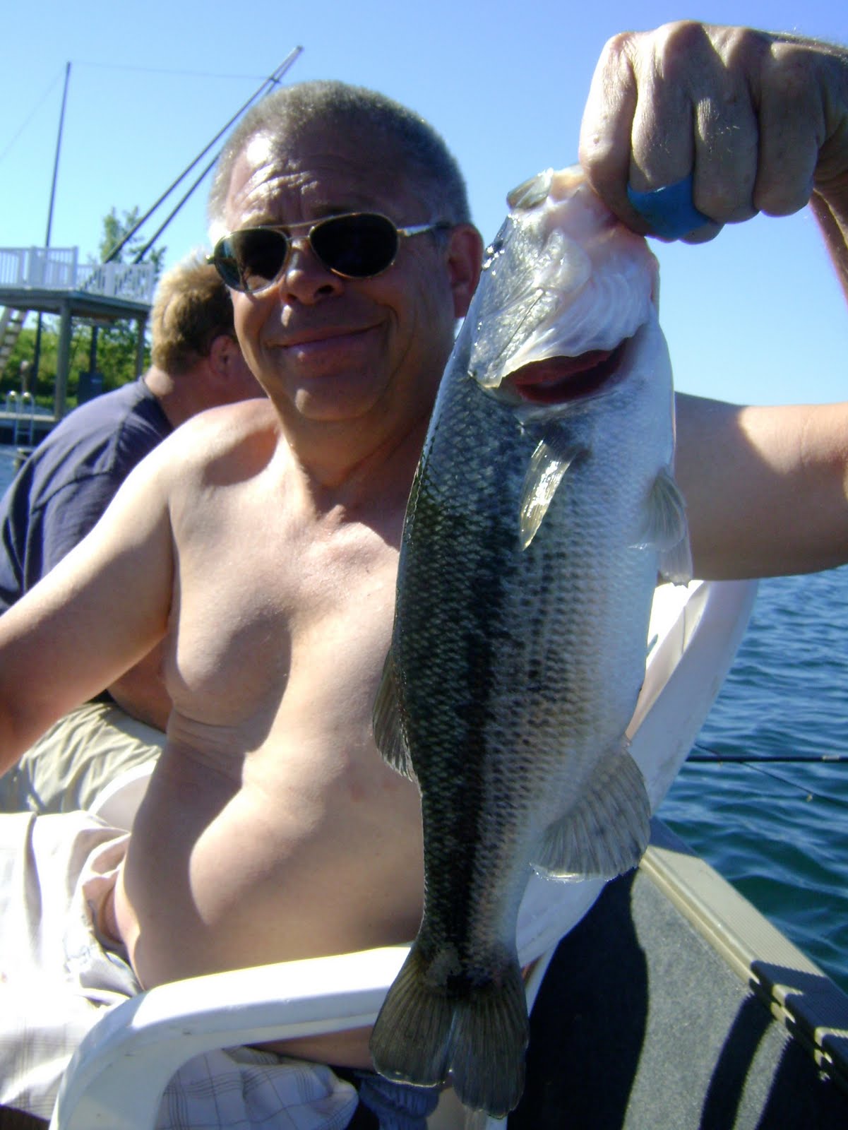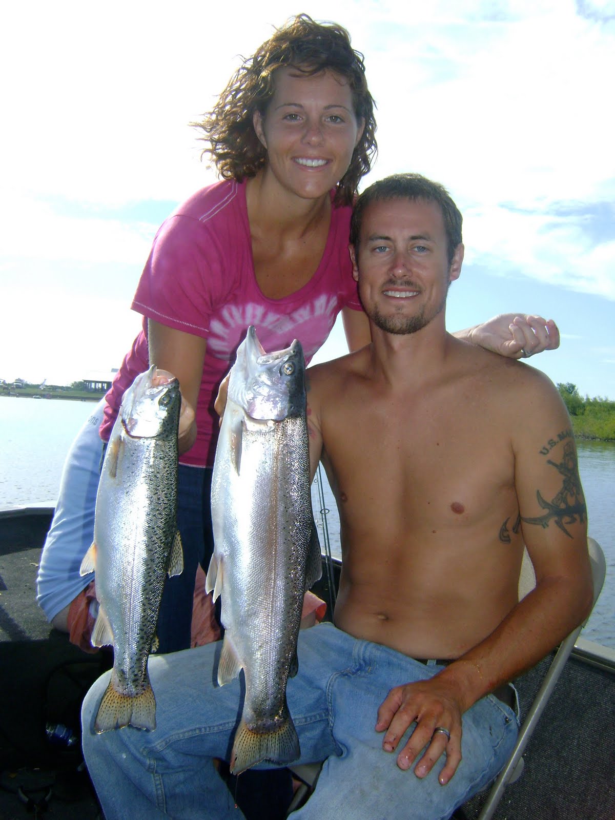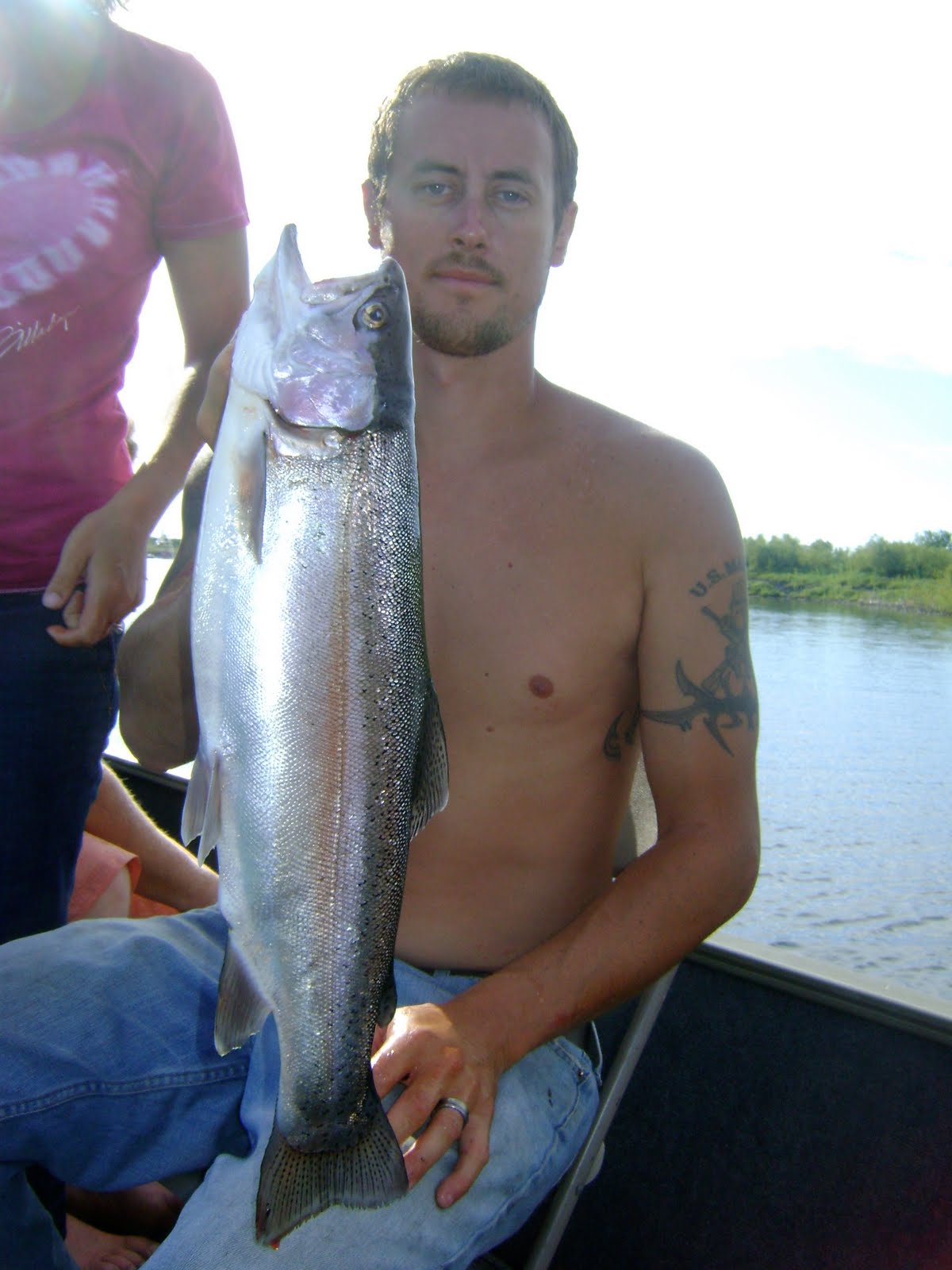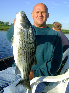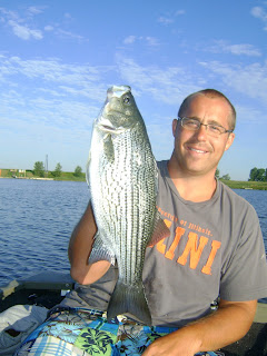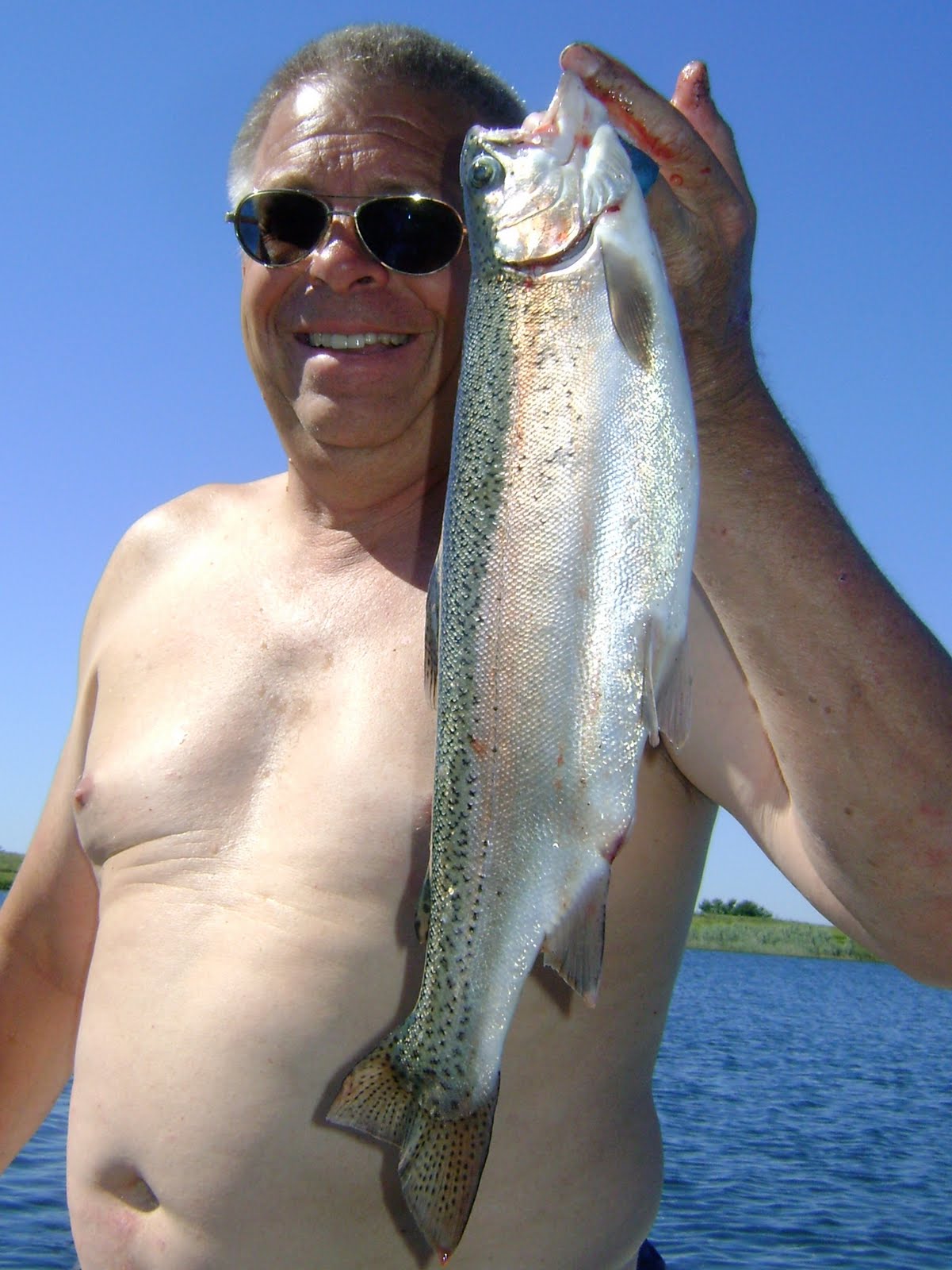 The move out deep in the last hour of the trip paid off big time. Fedi Davidovics, the Hungarian Handyman landed a 10 lb rainbow trout which we didnt get a picture of in order to get a quick release in the summer heat. That fish was an absolute monster consider it was stocked as a 1.5 lb fish back in 2008!!! We did get some good pics of this nice 4 lb rainbow and 7 lb hybrid striper that he caught though. We caught alot of fish out deep, that is an absolute blast dropping bait down to the bottom and having a big striper or trout come and slam it! We can locate the schools of fish pretty easily these days and just drop bait right down in front of their face!