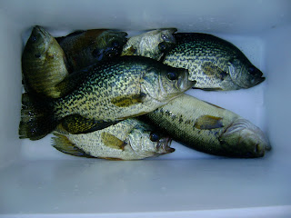Usually I like to take pics out in the boat, but with this being a tournament and me taking off fish, tangles, and baiting hooks nonstop while running the motor I just didn't get er done. Then once we got back the girls headed out swimming and I headed out to meet the excavator to talk about the wetland project for one of the lakes. Anyhow once we nailed down a gameplan with the bulldozer guy we counted our fish and snapped a couple quick pics. We ended up catching 33 crappies and 26 bluegill to win the tournament with a total of 59 fish in less than 2 hours on the water! If you do the math, that is exactly one fish in the cooler every 2 minutes of the trip.
