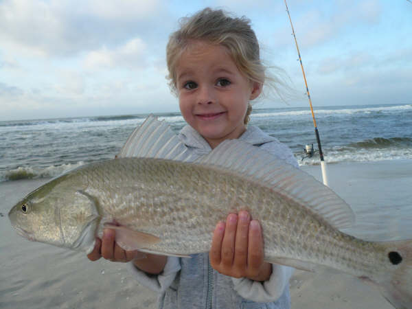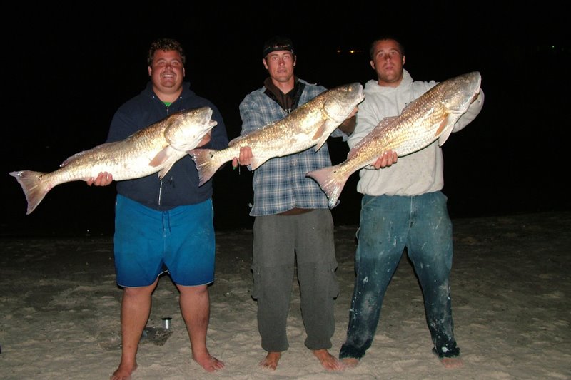 Our main species of fish we will be targeting this time of year from the shore are redfish, flounder, and whiting. Those are the best eating! We will also catch sheepshead, drum, ground mullet, ladyfish, bluefish, spanish mackeral, speckled trout, and a few varieties of sharks. Typically I use live shrimp and pinfish for bait and will put on just enough weight to keep my bait on the bottom. I look for deep pockets along the beach during high tide, and I will go to the passes where water rushes out of lagoons and bays into the ocean during low tides.