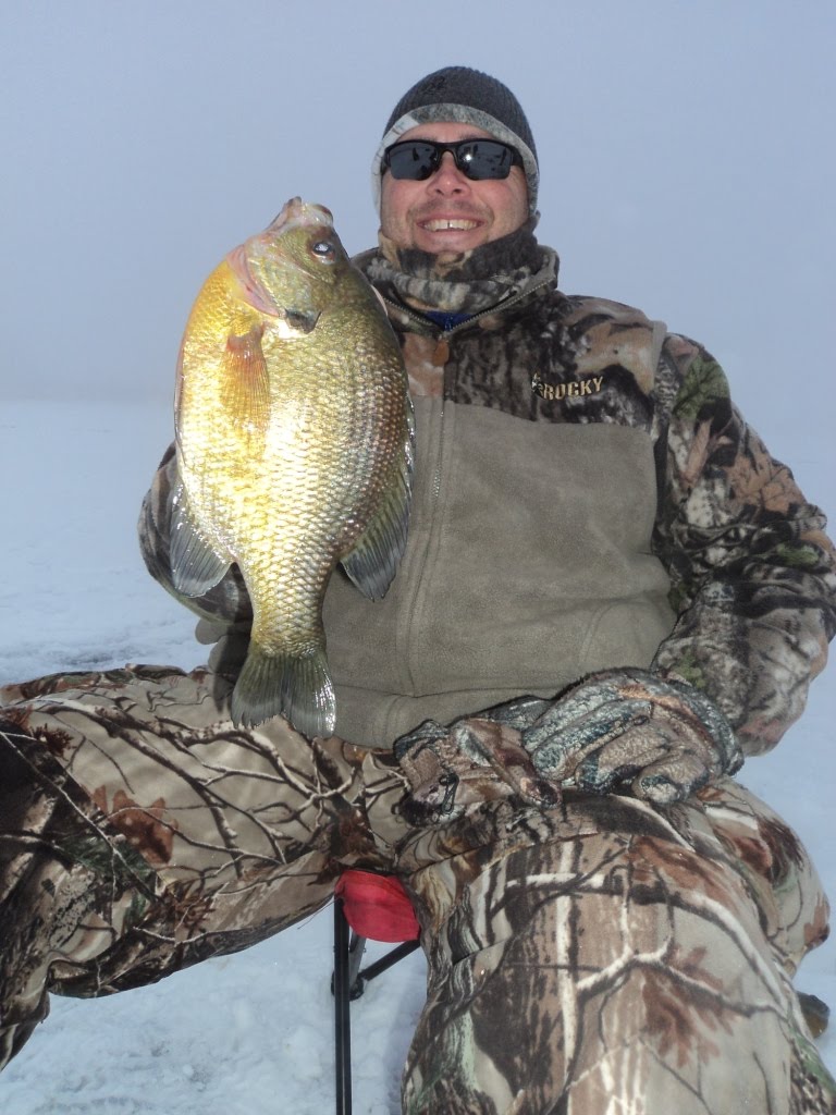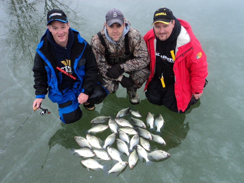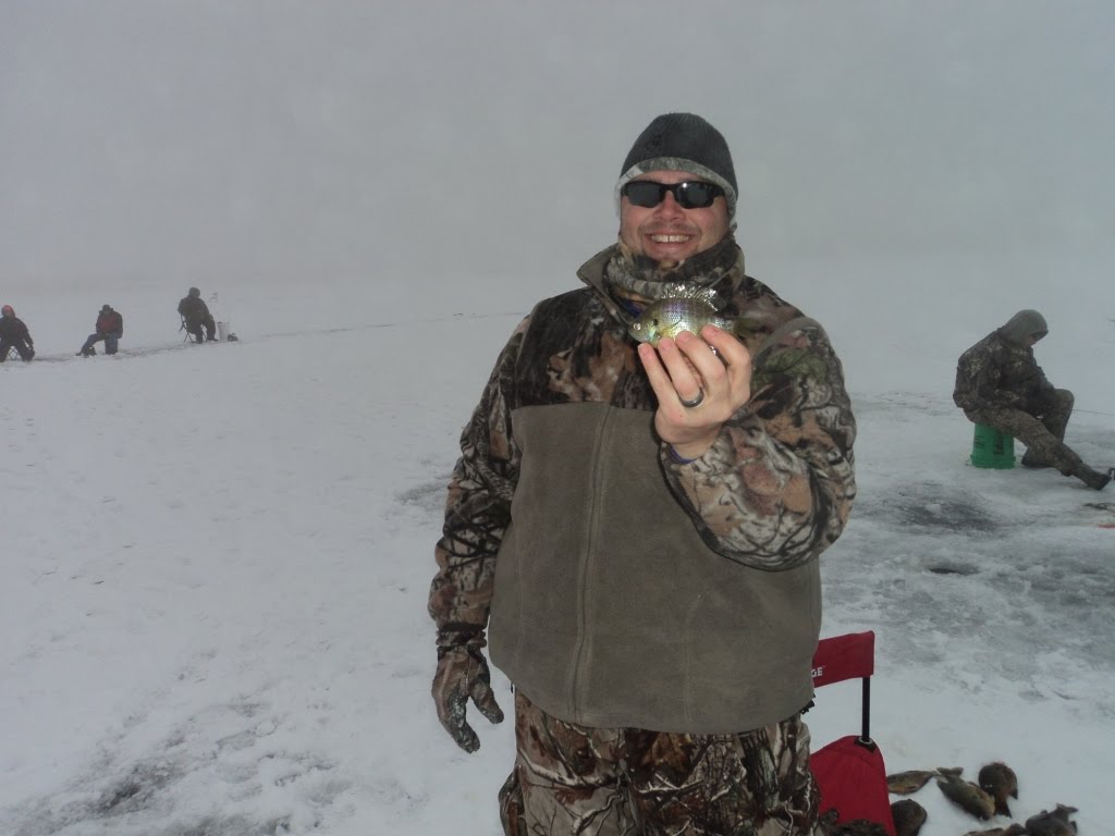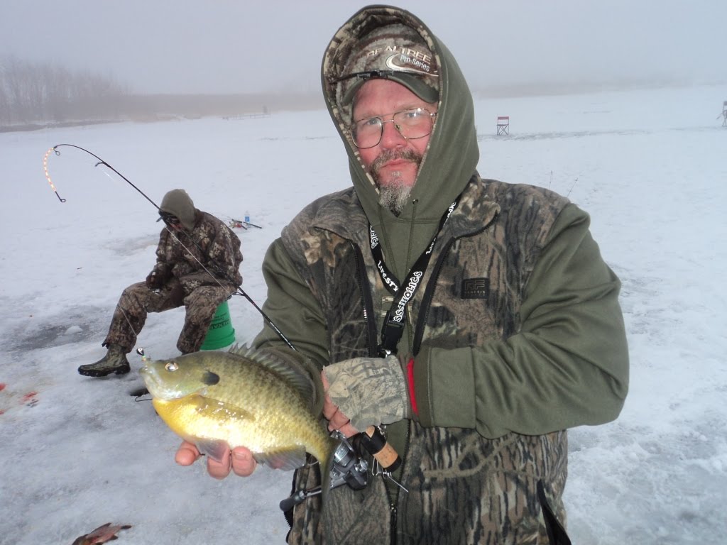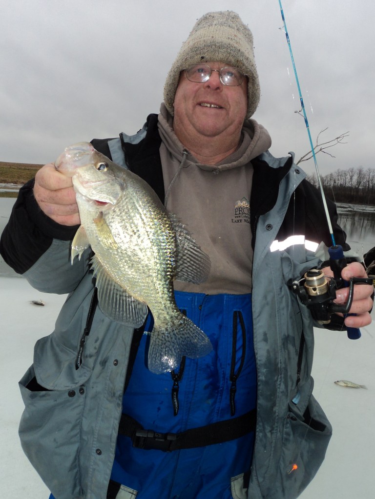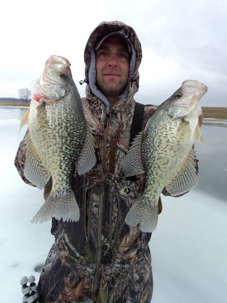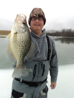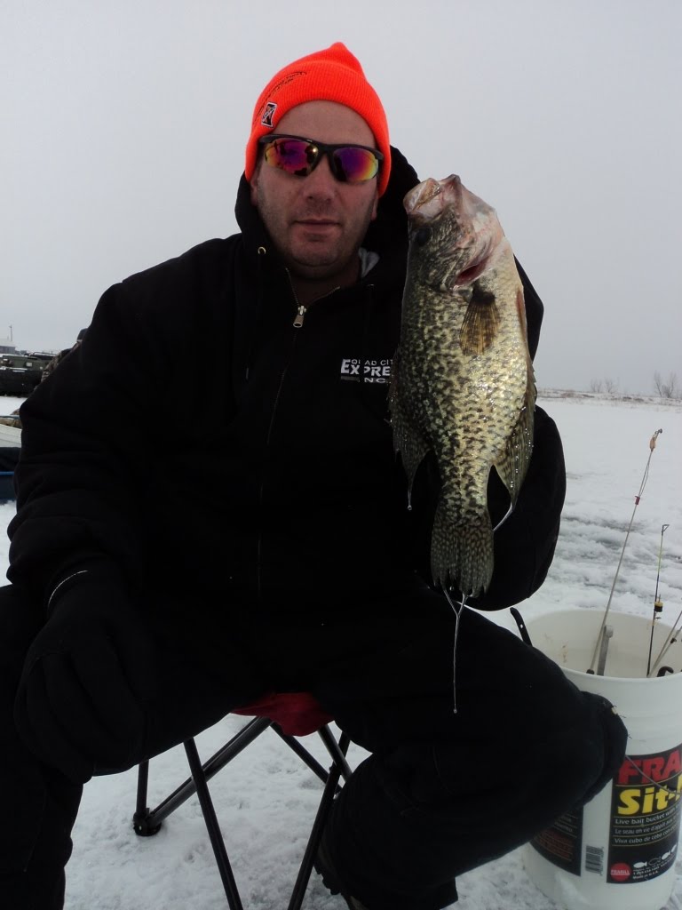 Ryan Pudik with a really big crappie he caught through the ice fishing a lindy jigging spoon tipped with a minnow head.