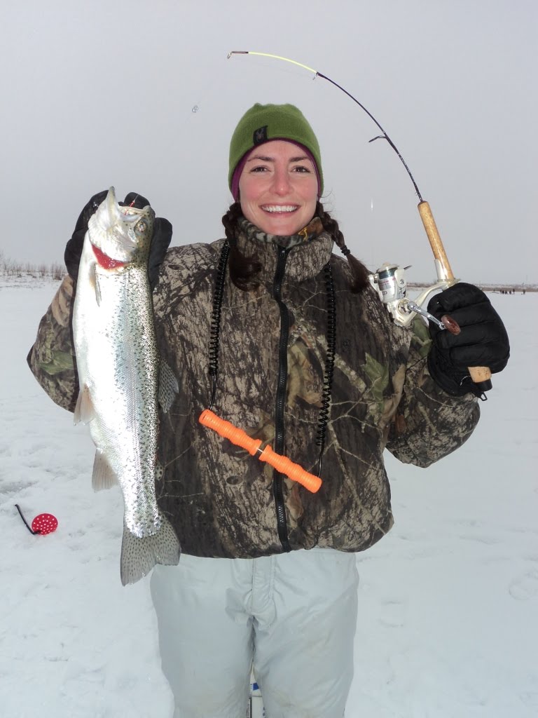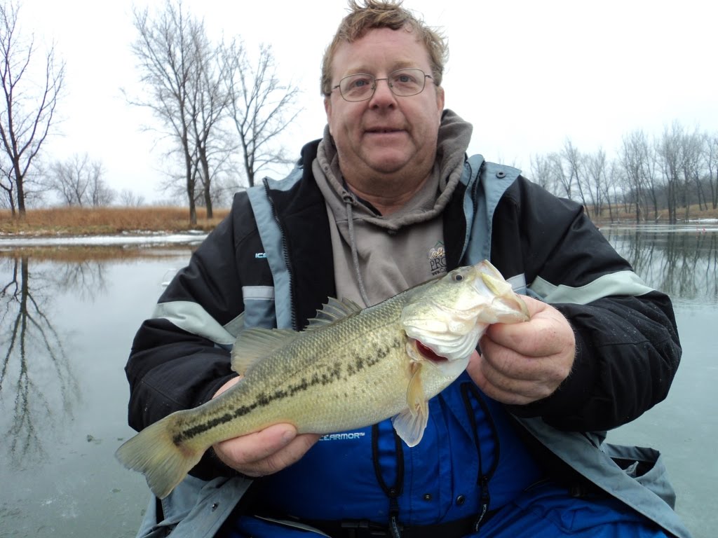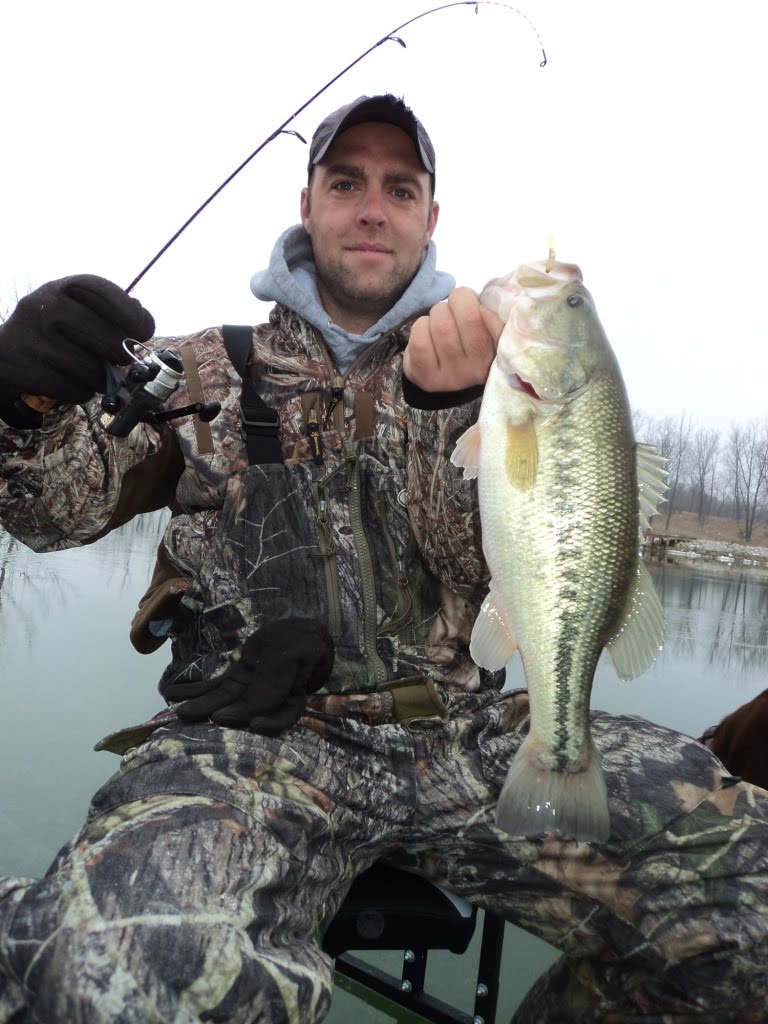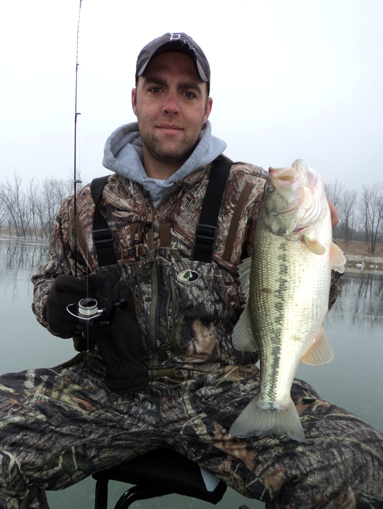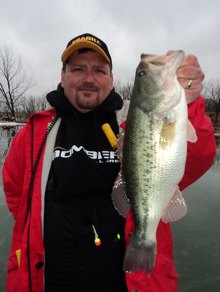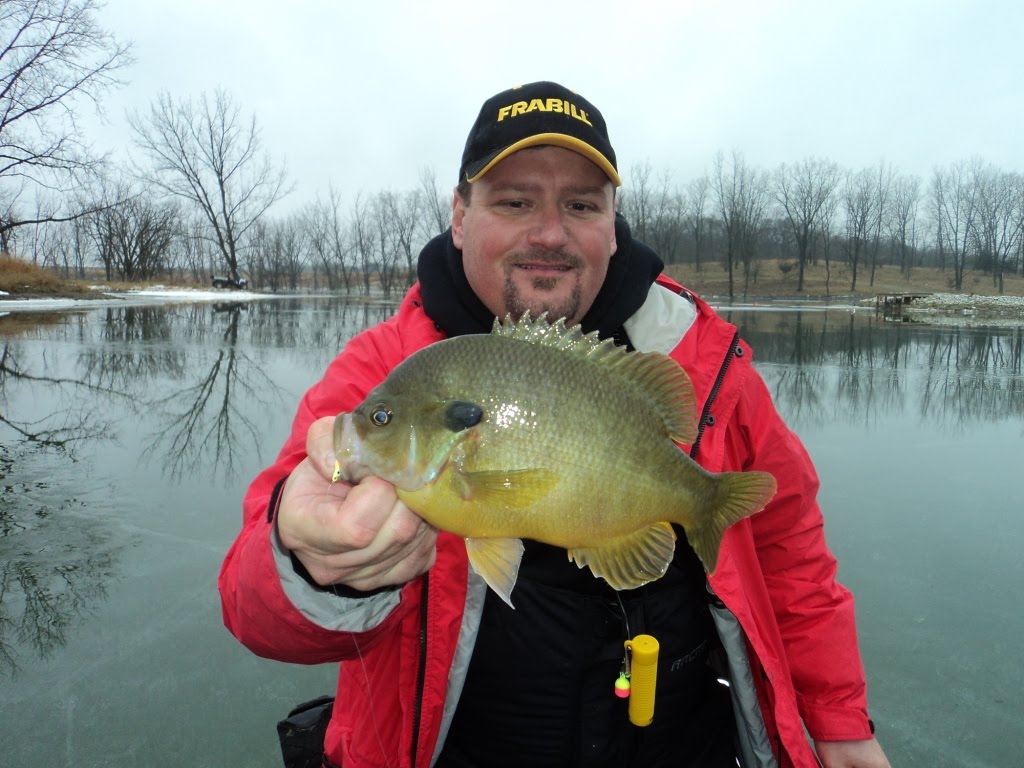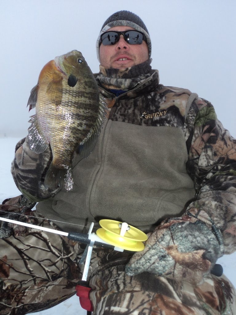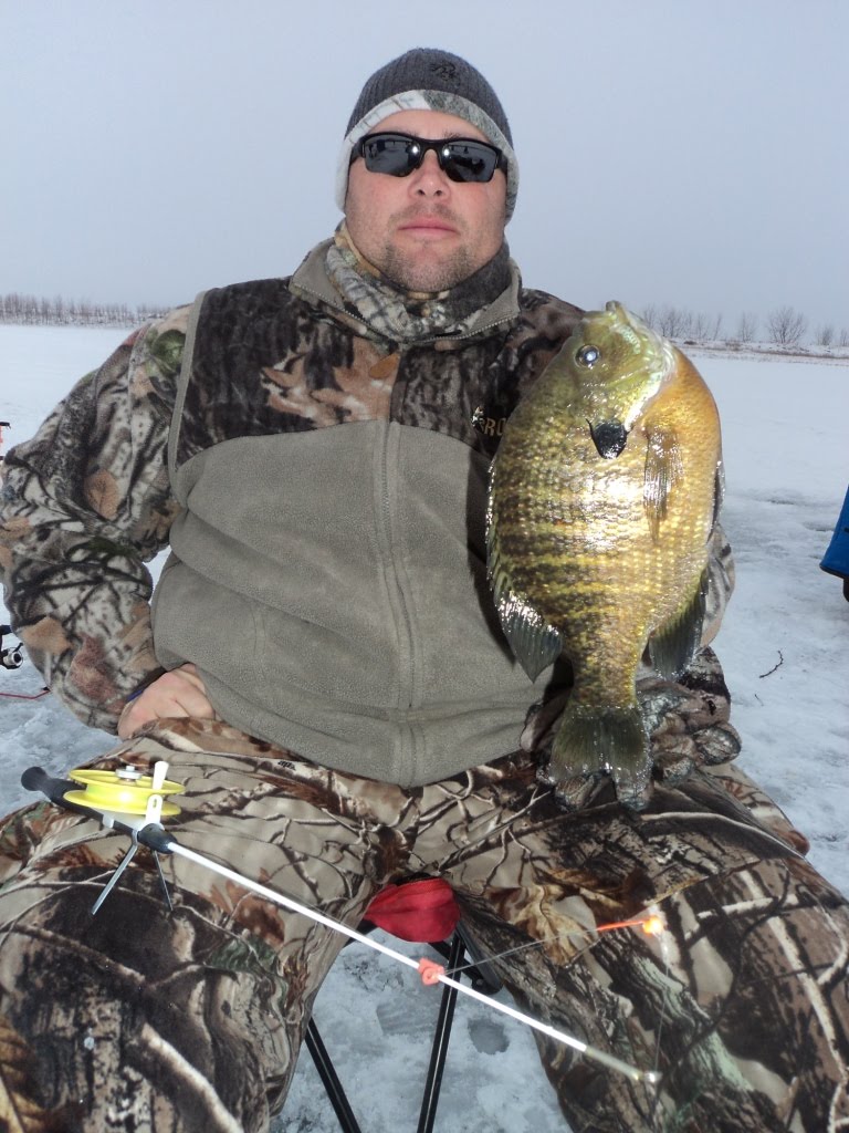 Ryan Pudik with a really big crappie he caught through the ice fishing a lindy jigging spoon tipped with a minnow head.