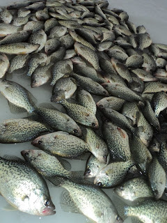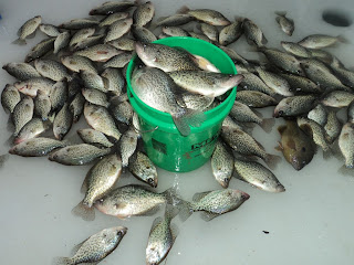 At noon when we decided to leave the first lake we tried, we were real proud of our pile of crappie for dinner. We keep all the crappies caught and trapped out of these lakes, because we don't want them to get overpopulated.