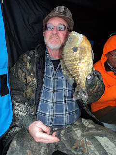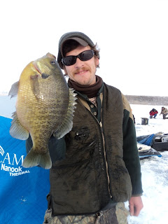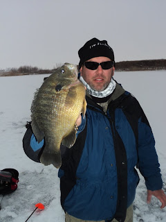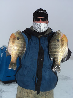 Here is a pair of crappie I got using a dead minnow on a plain hook with a split shot about 6 inches above the bait. I bet your wondering why I was using dead minnows for bait? Well, we ran out of 4 dozen live minnows at noon, and for some odd reason I had a small bucket of frozen dead minnows in the back of my truck from a previous fishing trip. I am not big on using lures (way too much work to jig em) so I just stuck dead frozen minnows on my hook, dropped em down and let the rod sit on the ice. Occasionally if I wouldn't get a bite in the first minute I would then jiggle the minnow just a bit, but only when absolutely necessary. Most of the time I enjoy taking photos and helping other fisherman more than actually aggressively fishing.