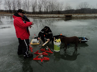 These guys have more ice fishing gear packed into their SUV than the whole Gander Mountain store in Peoria. Literally. Here we are getting setup for the day: