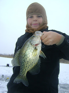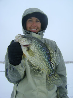 Brook got the boys down for their naps and came back out to fish with me and she smoked this big crappie. She watched the fish on the vexilar come darting up from the bottom as her two-spot jig tipped with a waxworm was slowing sinking on her first drop in a freshly drilled hole.
