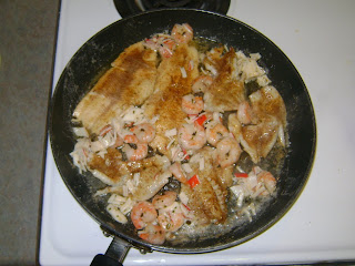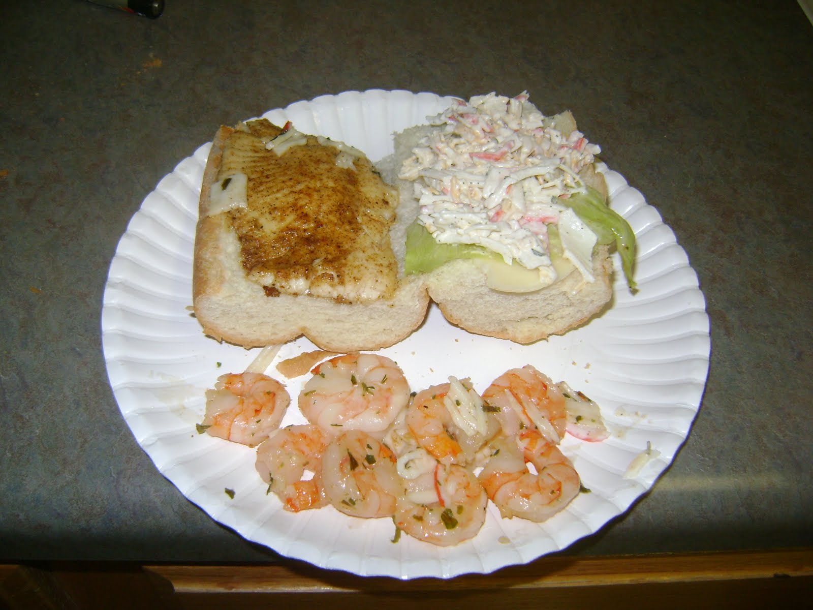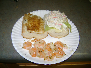 Then we drove the 30 miles back home in the snow at 30 mph. If you do the math it should take an hour to go 30 miles, but it took about an hour and fifteen minutes. Anyhow I cooked up some very fresh crappie fillets for dinner! We had leftover shrimp and crab from the Meister Christmas party last night so we cooked them up as well to compliment our crappie sandwiches!