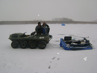 We loaded up our gear onto the argo and headed in. The argo is the ultimate ice fishing machine! The 8 wheel drive does awesome in the snow and ice and only needs 4 inches of ice to drive on safely. Plus if it would happen to break through it floats. Justin traded his riding lawn mower for the argo from an ad on craigs list. The guy wanted a good lawn mower and we wanted an argo! We got the better end of that deal for sure. Here is a pic of mom and dad posing today with the argo before going to get the other shanty.