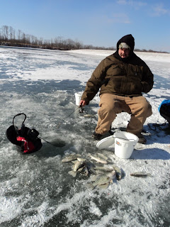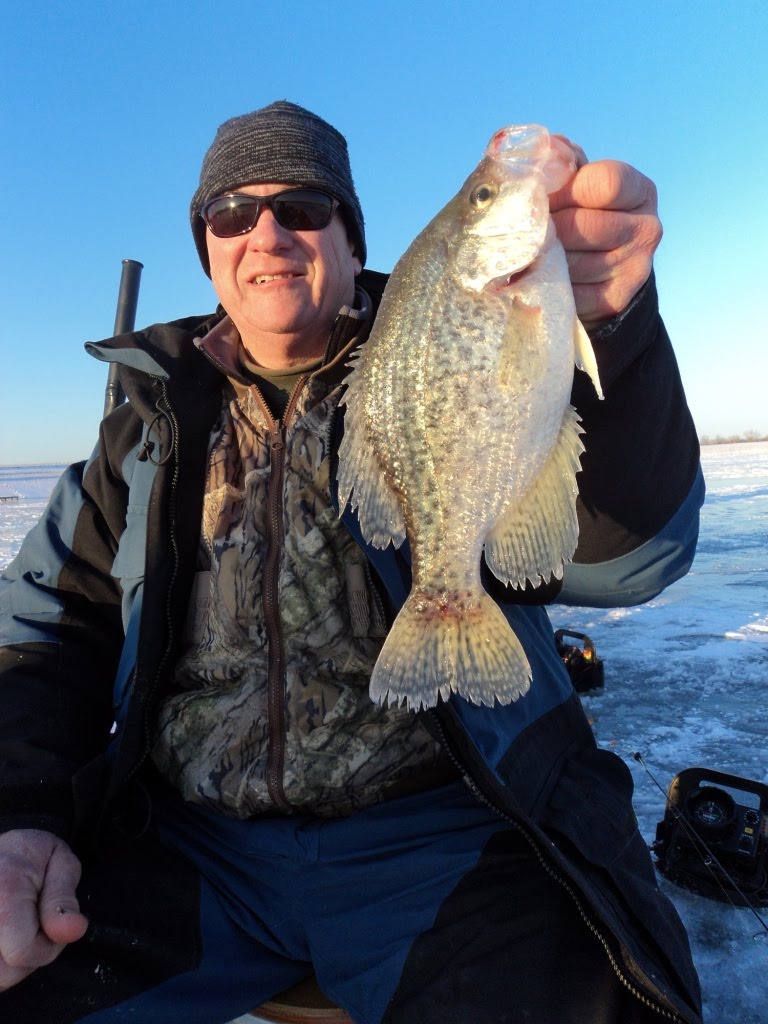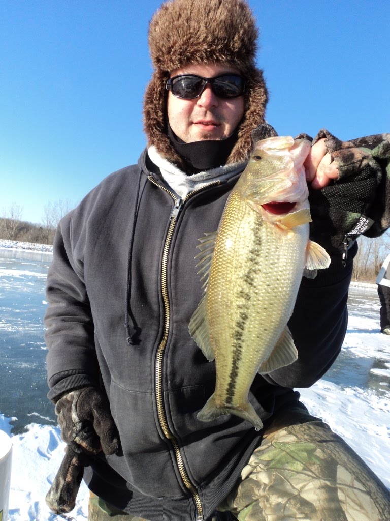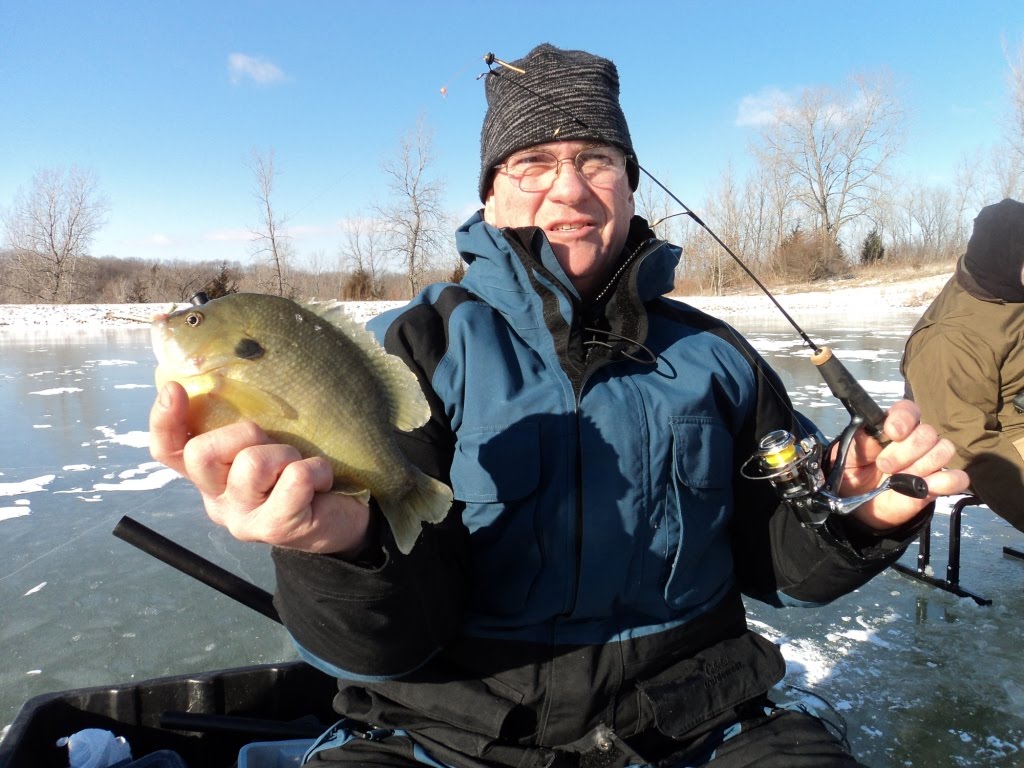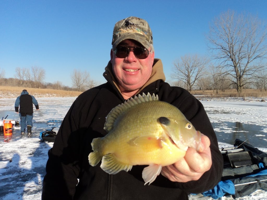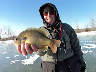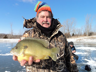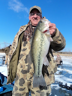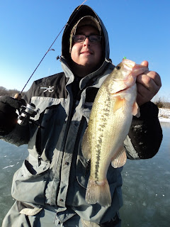 We fished from noon till dark. The crappies were 6-10 feet below the ice in 15 feet deep of water and were mainly caught on live minnows. The bass were isolated and mainly caught right off the bottom with small jigging spoons tipped with waxies or minnows. Occasionally when a bass wouldn't bite near the bottom we would entice him up a couple feet before he would finally nibble. The bluegills were in 9-12 feet of water mainly on the bottom with small jigs and waxworms. The fish actually were more active at noon today than in the evening. The bite got progressively worse as the day went on. For some reason the coldest days the fish are biting better in the mornings and on warmer days they are biting better in the evenings. I will be paying very close attention to this pattern to see if it continues???