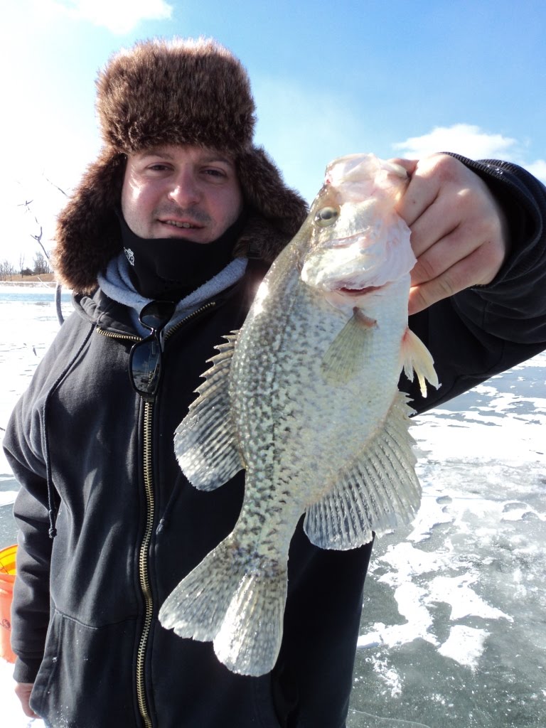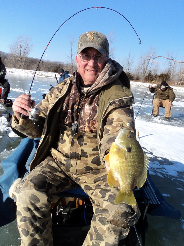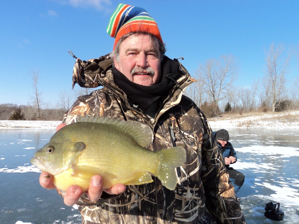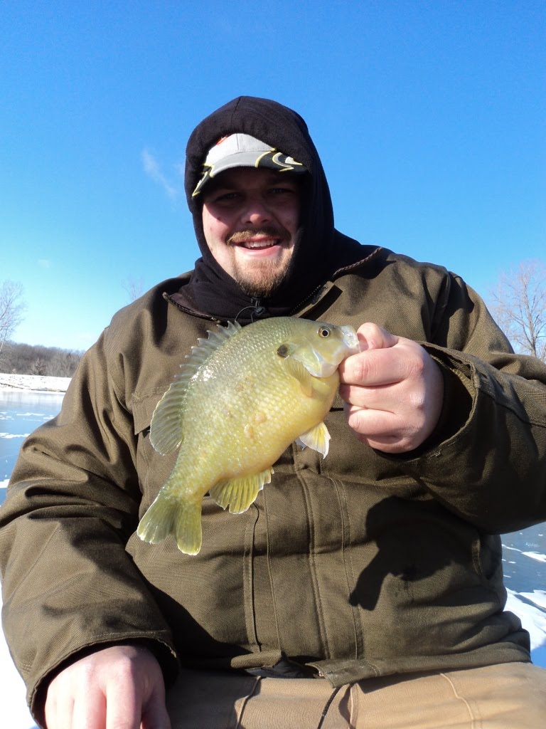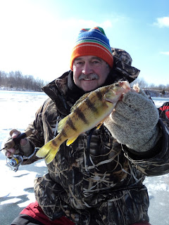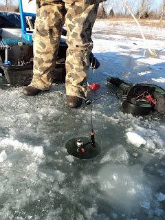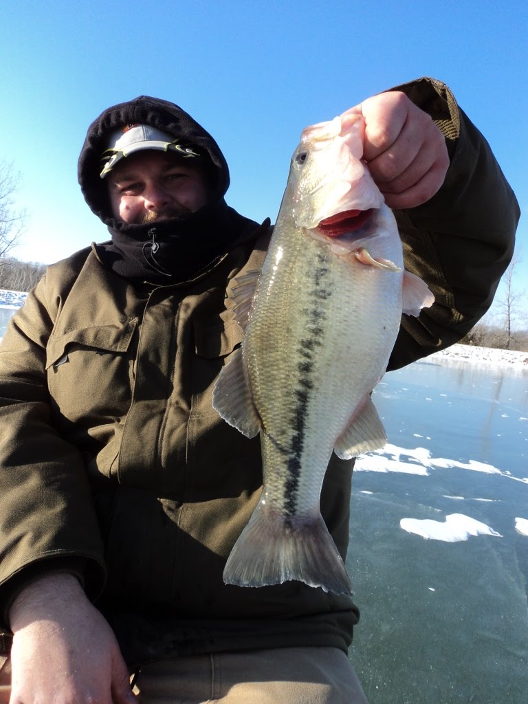 We fished from noon till dark. The crappies were 6-10 feet below the ice in 15 feet deep of water and were mainly caught on live minnows. The bass were isolated and mainly caught right off the bottom with small jigging spoons tipped with waxies or minnows. Occasionally when a bass wouldn't bite near the bottom we would entice him up a couple feet before he would finally nibble. The bluegills were in 9-12 feet of water mainly on the bottom with small jigs and waxworms. The fish actually were more active at noon today than in the evening. The bite got progressively worse as the day went on. For some reason the coldest days the fish are biting better in the mornings and on warmer days they are biting better in the evenings. I will be paying very close attention to this pattern to see if it continues???