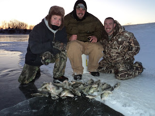 I fished with 2 groups of guys today. Justin, Patrick, and Will made the trip over from Lincoln, IL and Jim's group of guys were mainly from the Quad Cities area. With the bright sun, high pressure, and frigid windy temps I knew the bite was going to be pretty tough. Its just a good thing we were fishing in some of the most productive fish water in the state! We marked a bunch of fish, but had to work pretty hard to get them to bite. Without Vexilars we really wouldn't have caught many fish at all. Here are some really big and fat bass on super light tackle!