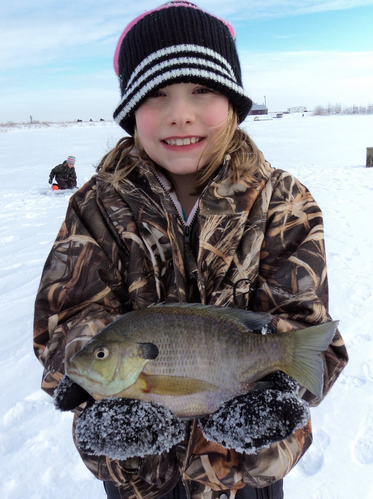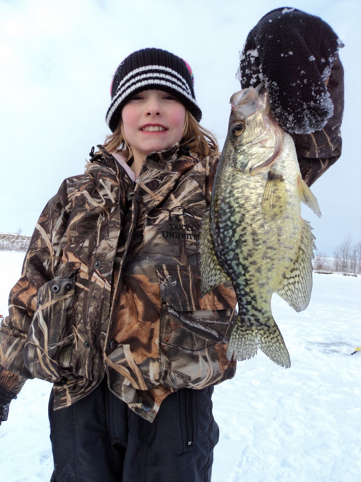 Friday afternoon we fished with some folks from the east side of the river. These girls were simply amazing outdoorswomen! There aren't many girls this age who could spend 4 hours outside in the winter on the middle of a lake and not get bored, or cold, or cranky! Especially when the fish were not biting.