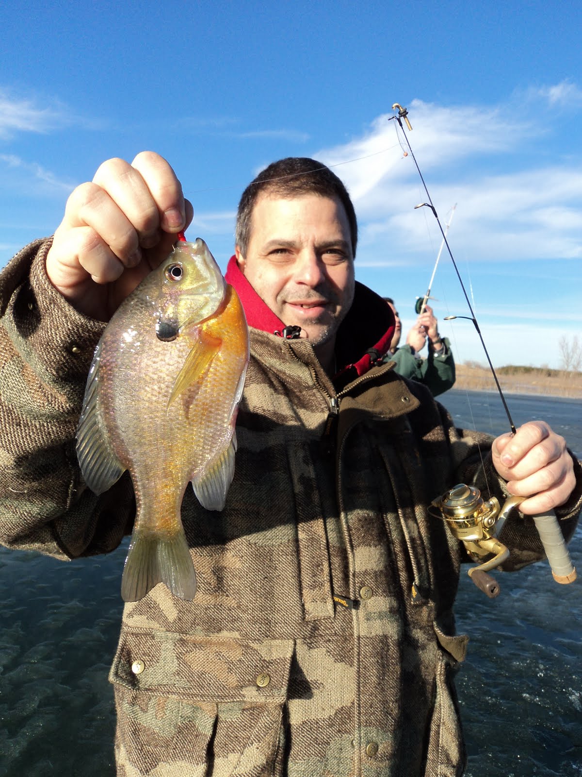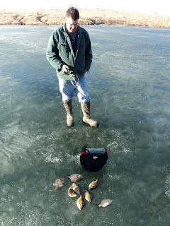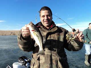 Anyhow then I headed over to meet up with some clients to talk game plan 2011. It just so happened we found some marginally safe ice on one of the lakes and it just so happened I had 4 ice fishing rods and 3 vexilars an auger and some old bait left in my truck. It also just so happened to be 55 degrees and sunny outside. After a couple hours of finding nothing willing to bite it just so happened we found some strategically placed trees submerged 15 feet down out in the middle of a cove and it just so happened we caught some nice fish for dinner!