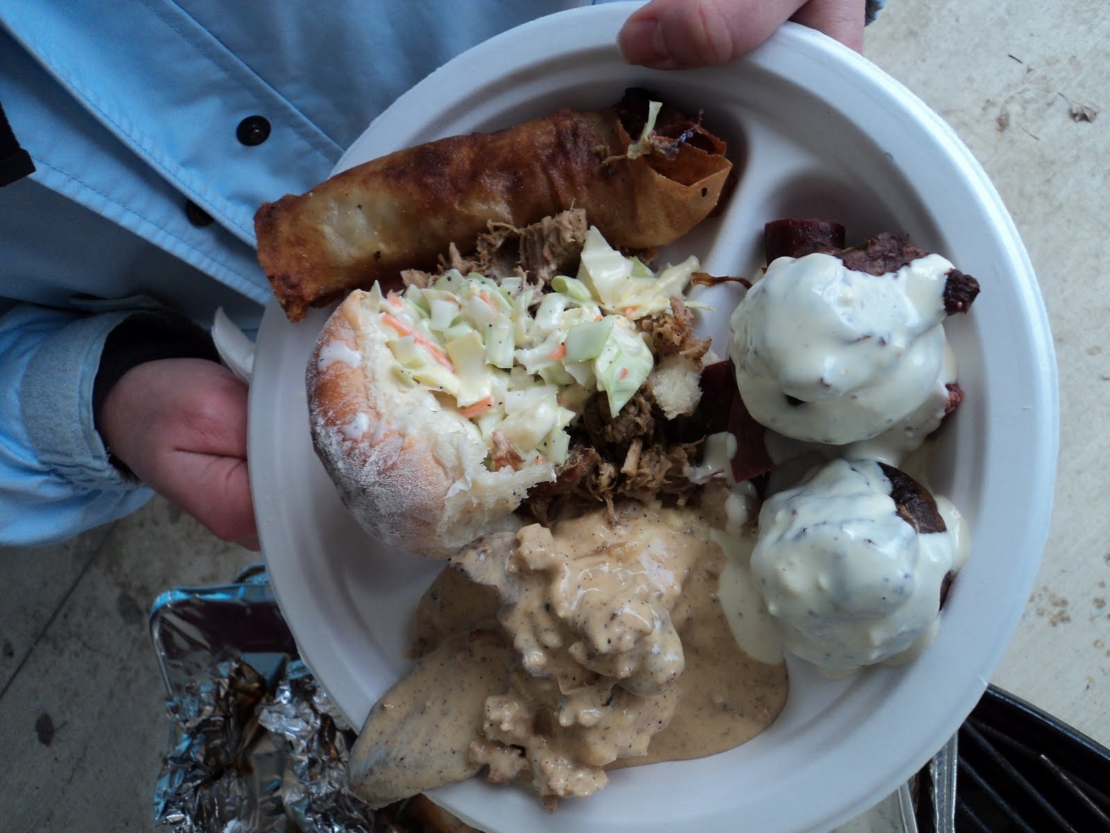 Duck eggroll, Chef's famous cole slaw, pulled pork sandwich, elk stuffed mushrooms covered with grilled bluecheese sauce and jalapeno mashed potatoes smothered with goose gravy!