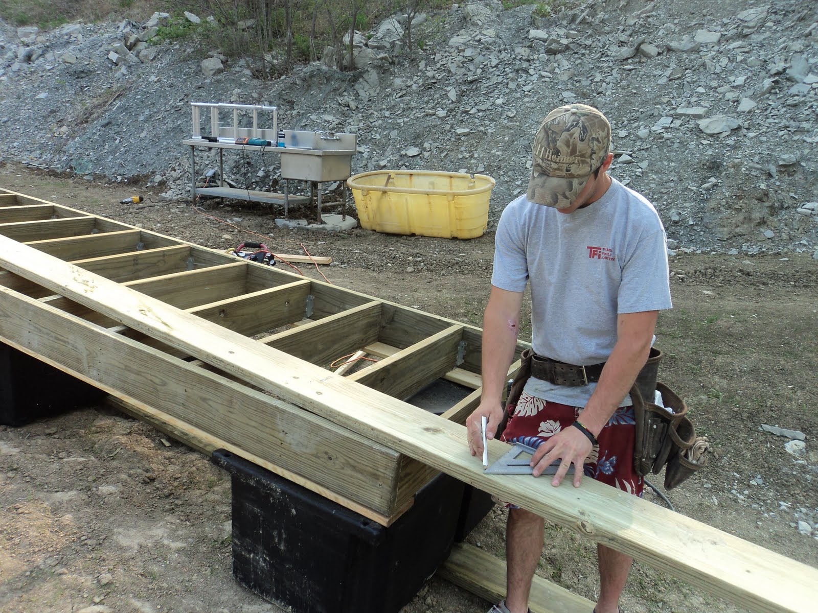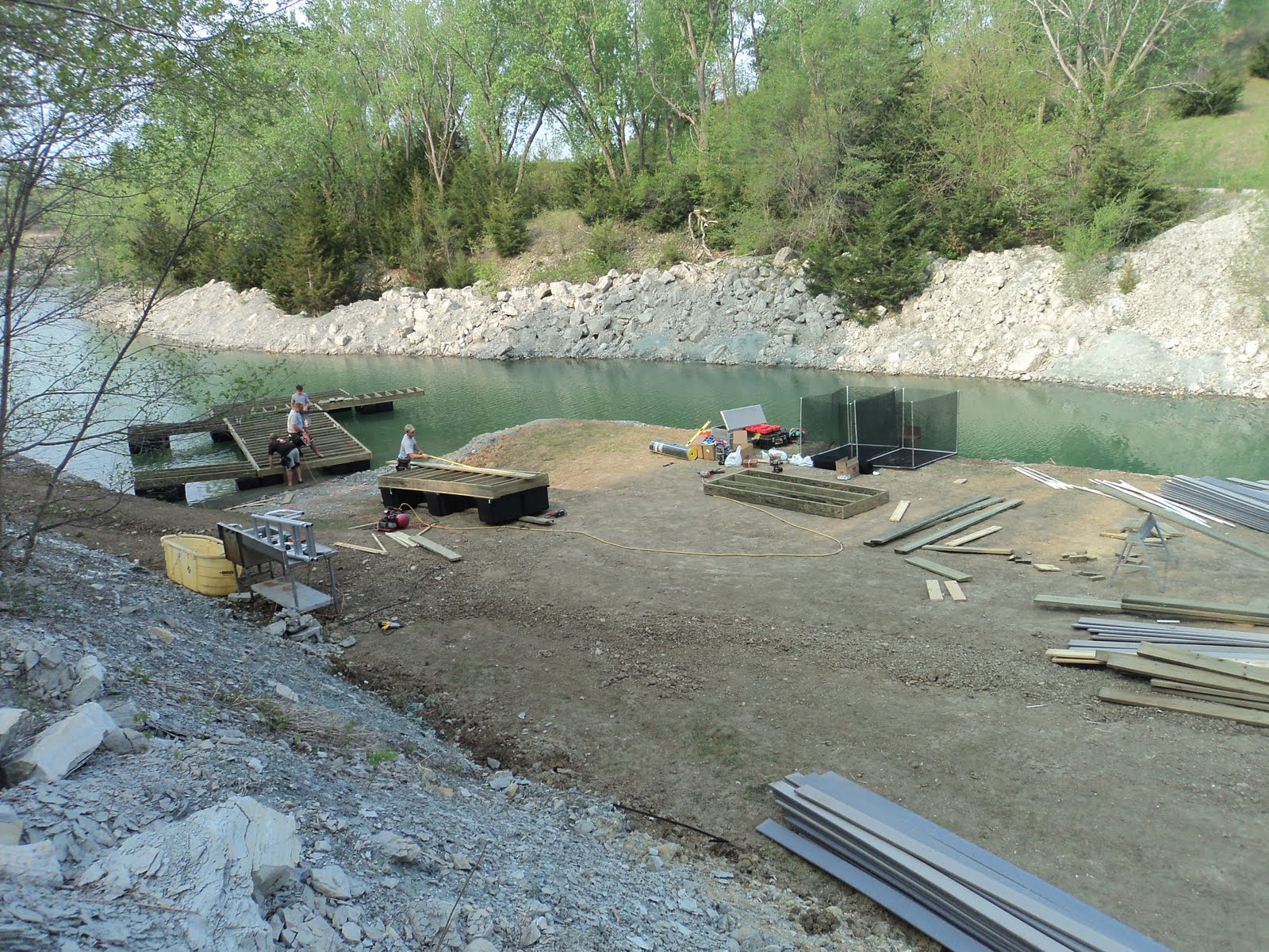 Next morning we were up at 5:45 am and hit the continental breakfast and headed out to our next job which was about 10 miles South of Lincoln. For both these projects we had all the hardware and floats shipped in and all the Lumber delivered locally. This project was much, much bigger than the first dock. This was a 20x42 with built in fish cages, a 5' jump dock, and a boat slip. Also we built two sets of stairs going down to the dock and had to get real creative with the footings since all the shoreline is made up of limestone and various other forms of rock.