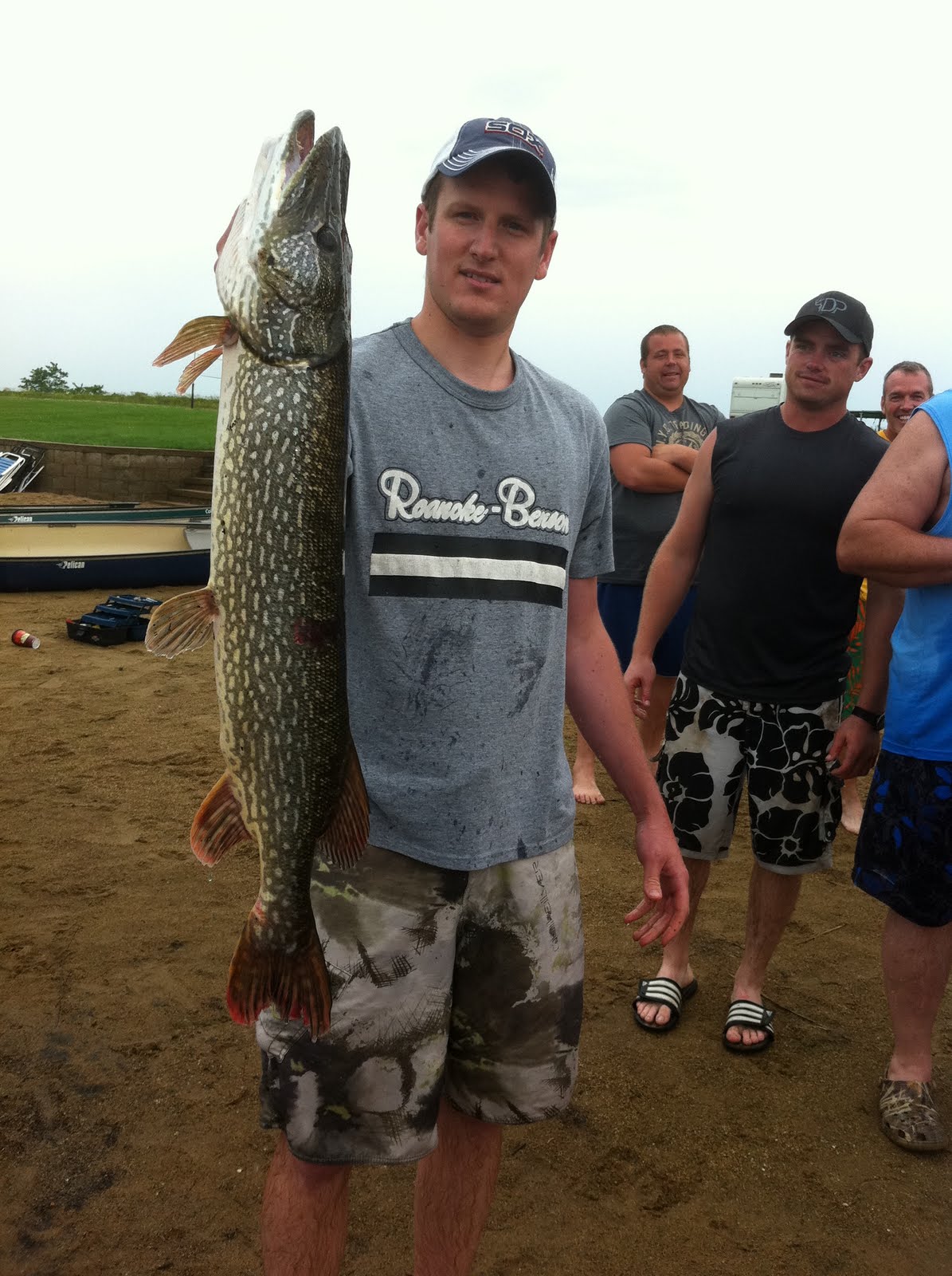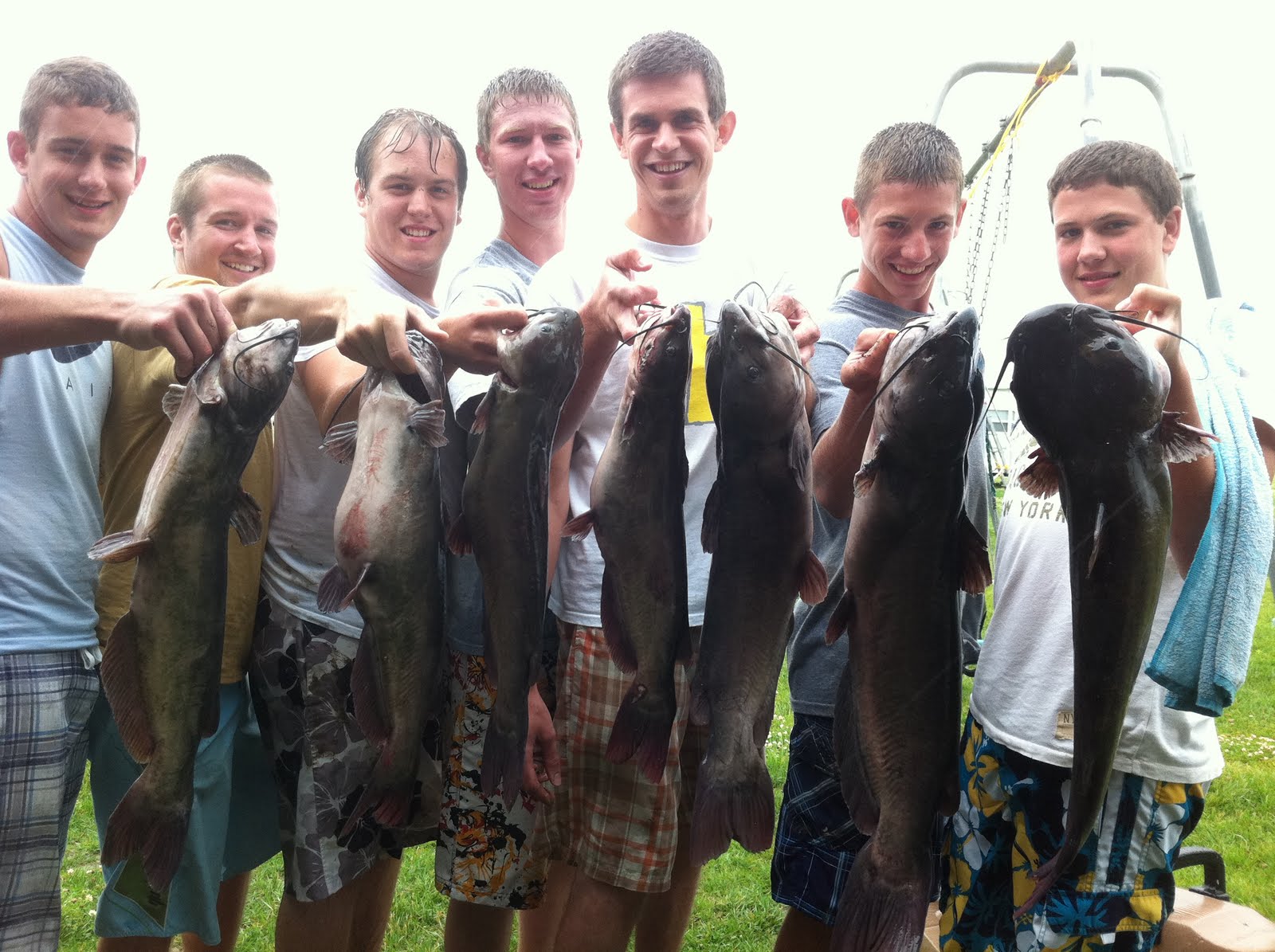 Every single muscle and I think maybe even several bones ache this morning. After the basketball tournament we went out to the lake with all 200 guys and we played hard there too. We also caught bunches of catfish, hybrid striped bass, and even this monster pike. Then we cleaned all the catfish and had a big fish fry.