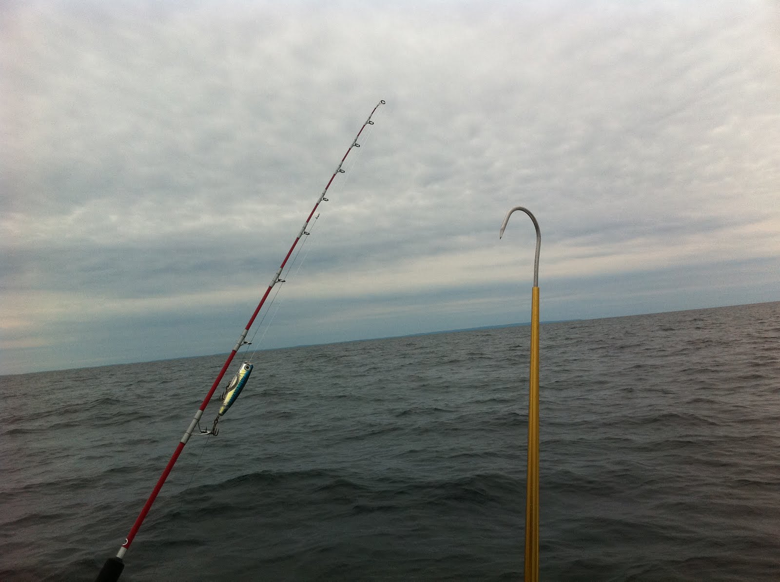 Unfortunately we didn't get the opportunity to hang out with some tunas up close and personal, the wind was blowing from the East and the sun never could shake off the clouds. Generally for chasing tunas in the bay you want it to be calm and sunny. Anyhow I snapped a photo just to break up the monotony and add some scenery to this story. The big hook in the picture is not the harpoon, it is just a gaff that we would have used to get the tuna into the boat.
