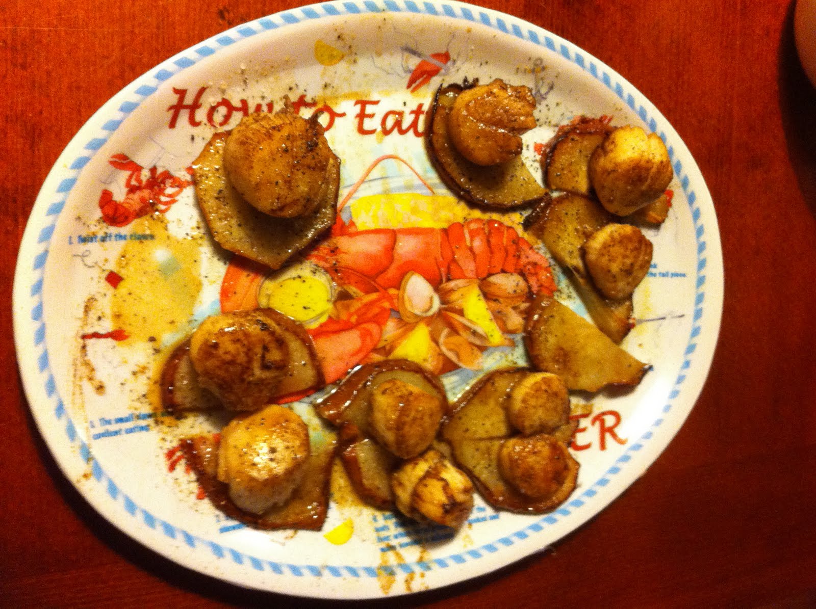 As a matter of fact I am eating seared scallops on top of seared pear slices marinated in some special Cape Cod lemon marinade. Eating while I type. Take a look at this appetizer:
