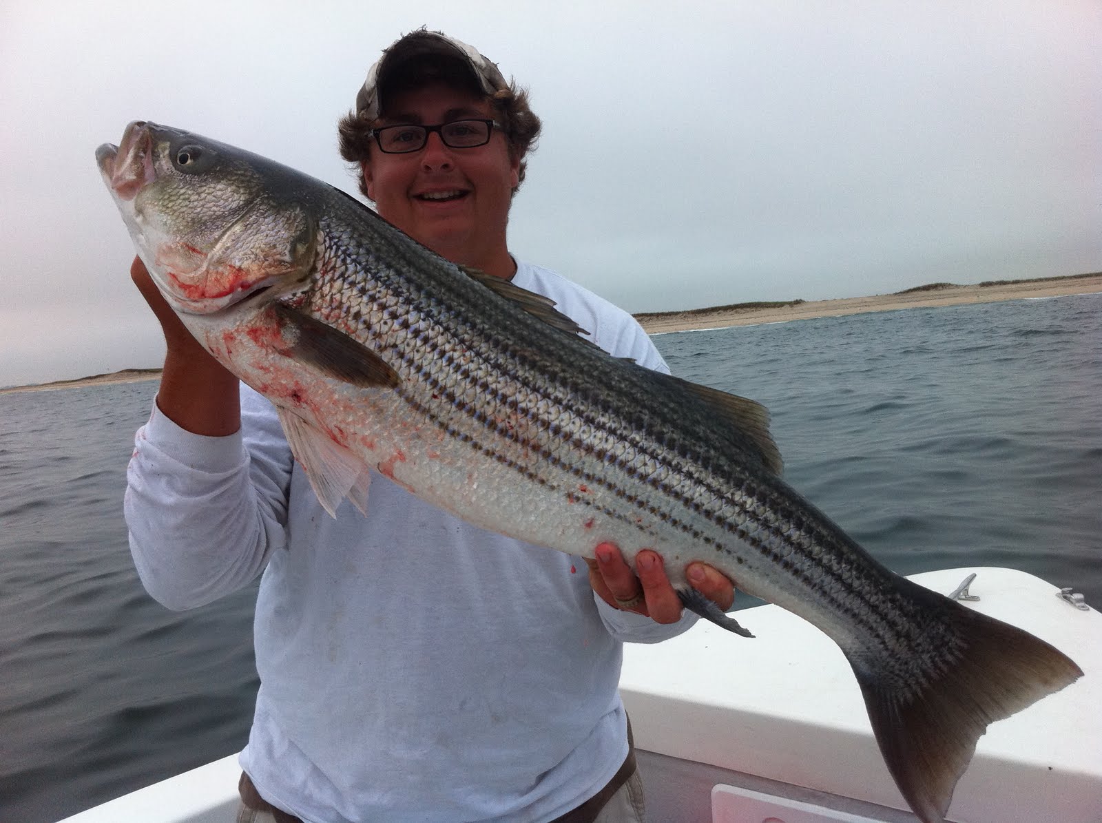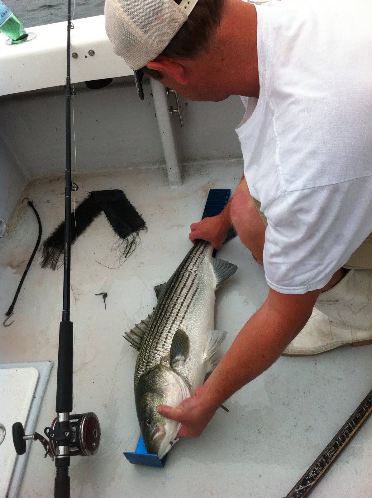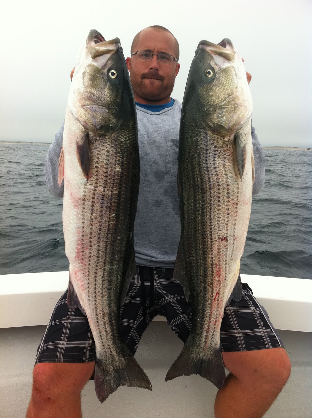 We motored out to a remote beach and spotted a bunch of birds dive bombing baitfish. Instantly hooked up the moment our big diamond jigs hit the water! Crazy. Insane. Unbelievably Awesome. My first striper was a 10 lber, but it was too short to keep. They have to be 34 inches long to be legal fish and we caught tons of 32" 10 lbers. Here are some pictures of short fish that had to be released: