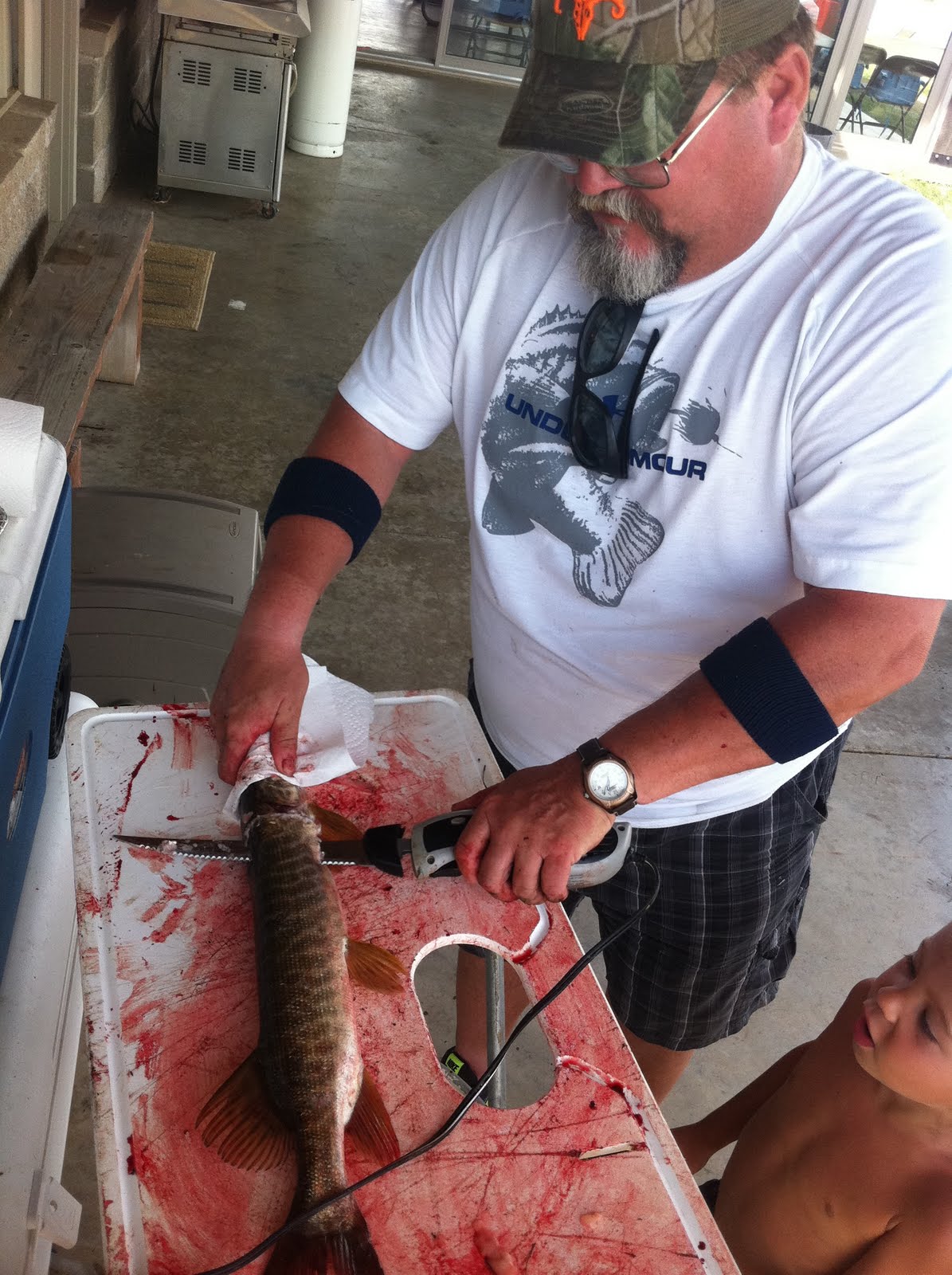 We also caught a ton of bass on a mid-day topwater bite over deeeep water which was fun and we caught and ate this muskie: Seems kinda crazy to eat a muskie, but I have too many in that particular lake and am harvesting about 10-12 per year. I had to get a pic of Todd cleaning a muskie!