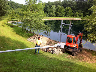 We stood the center pole up with some do it yourself engineering and our Kubota mini-excavator. The hill is too steep and the asphalt road leading back to the property is too fragile for a big crane. We used our electrofishing boat as a platform to hold the ends of the poles out in the water and the mini excavator to set the poles on the shore end. Then we winched the poles up in place.