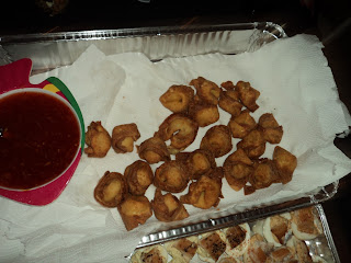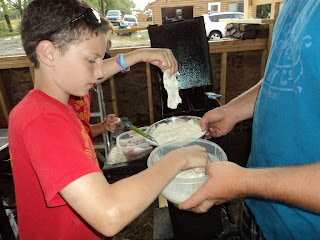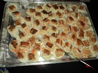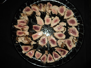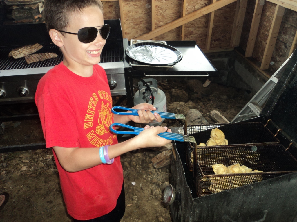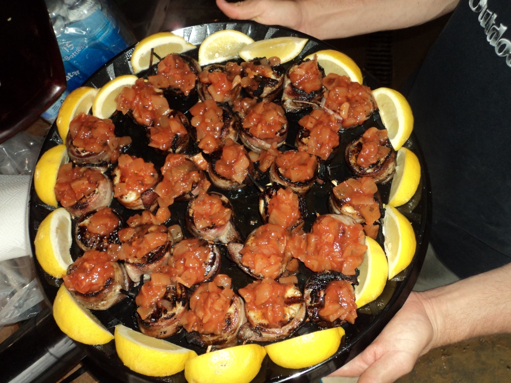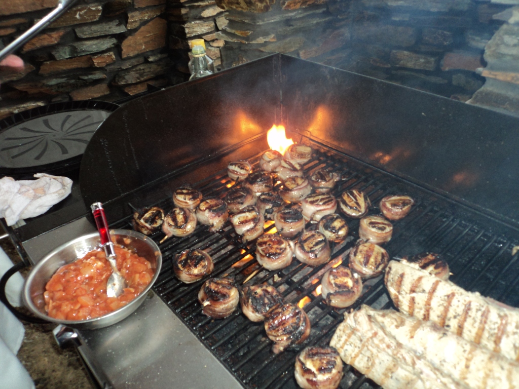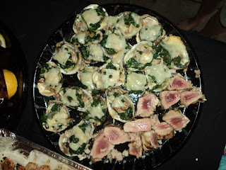 Then we cleaned and cooked up the fish along with some bacon wrapped scallops, crab rangoons, shrimp skewers, oysters rockefellar, Ahi tuna, apple cinnamon chicken breasts, and filet mignon. All I can say is WOW, Chef was able to pull all that off in the midst of a big thunderstorm with lots of mud, basically out in the great outdoors with some make shift shelters and a leaky roof.