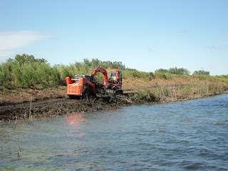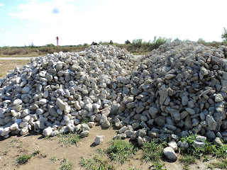Justin, Lee, and Dave started our shoreline rehabilitation project over the weekend. To prevent erosion and to make a nice patch around our lake, we are putting in a trail that will be rip rapped around the entire lake. I can't wait to be able to walk around the lake and catch fish hanging out by the rocks!! Just an FYI for those of you thinking about rip rap, we found a source for reject concrete that will be our base layer and will be putting it out quite a ways in the water, then we will cover it up with this nice rip rap stone for looks! The concrete costs about $15 per ton and the stone about $20 per ton delivered. Semi trucks can hold about 20 tons. In this picture, the reject concrete is on the right and the stone rip rap is on the left.