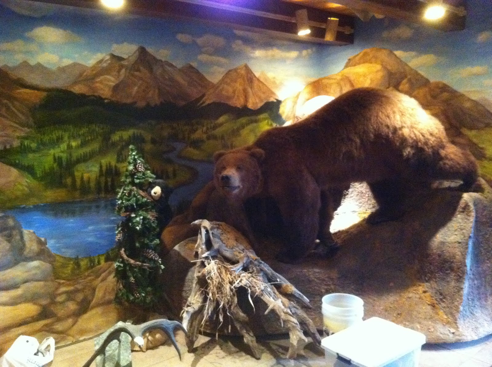 If you walk in the cabin and turn to the right you are greeted by this amazing grizzly bear and mountain scene!