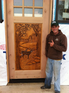 Front door of the hunting lodge we are working on. Pretty cool wood carved scene!