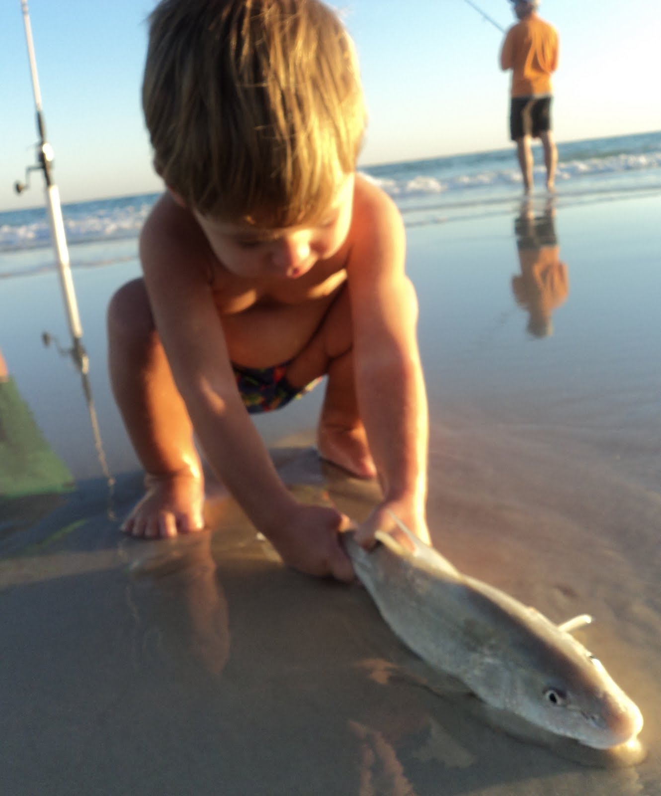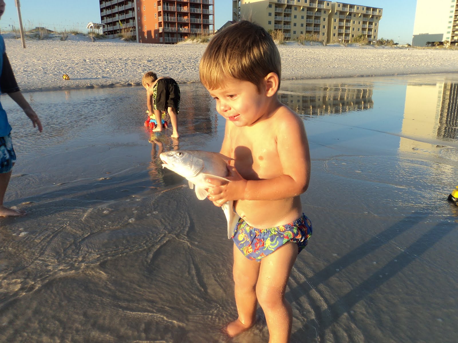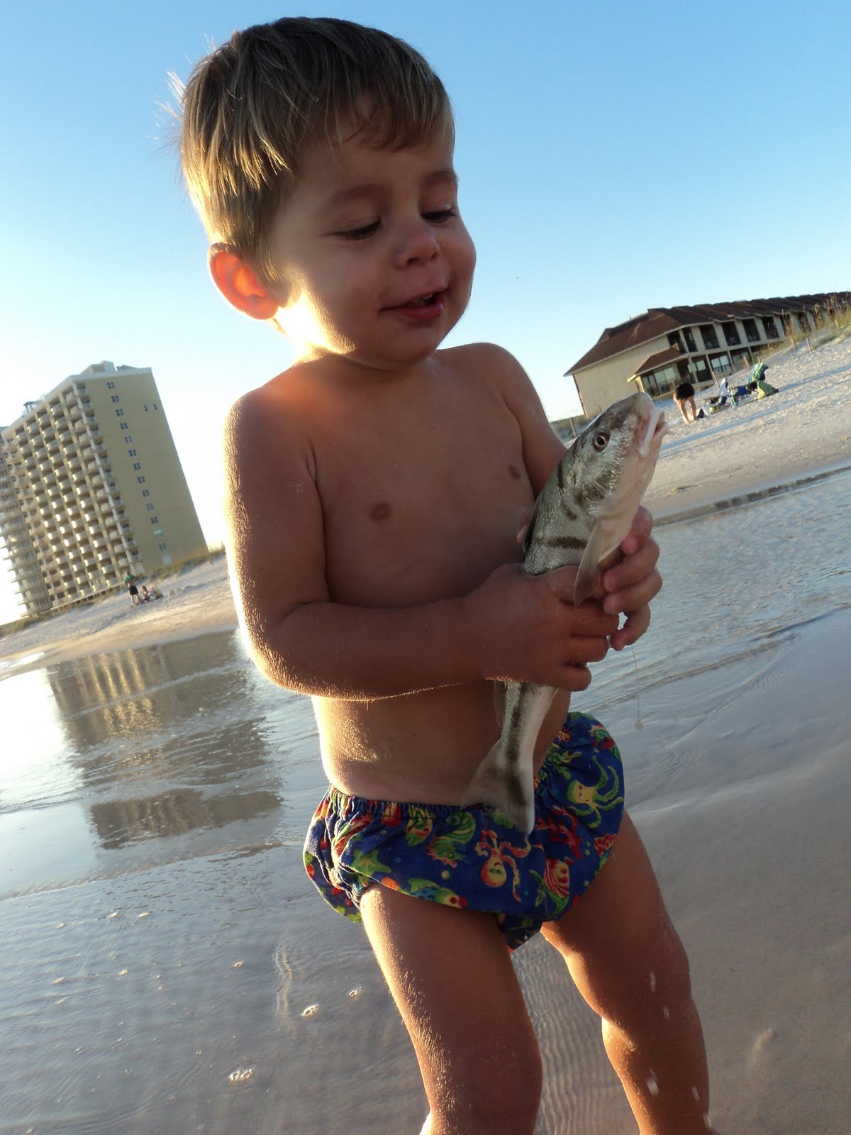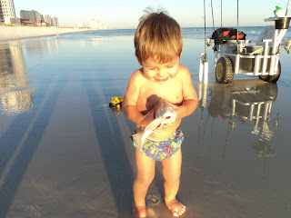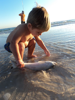 Fishing is great right off the beach. Naturally we got done swimming and started fishing as the sun started setting. Drake is really into all things outdoors and he especially loves fishies! He wants to be outside 24/7 even when its dark. He just hates inside and always wants to be out. Gets kind of annoying to always have to deal with him wanting to be outside everytime he hears a door open or close, but down deep my heart beats happily knowing outdoors is where he truly wants to be! This boy is gonna far outshine his daddy someday...... I was so proud I had to take tons of pictures: