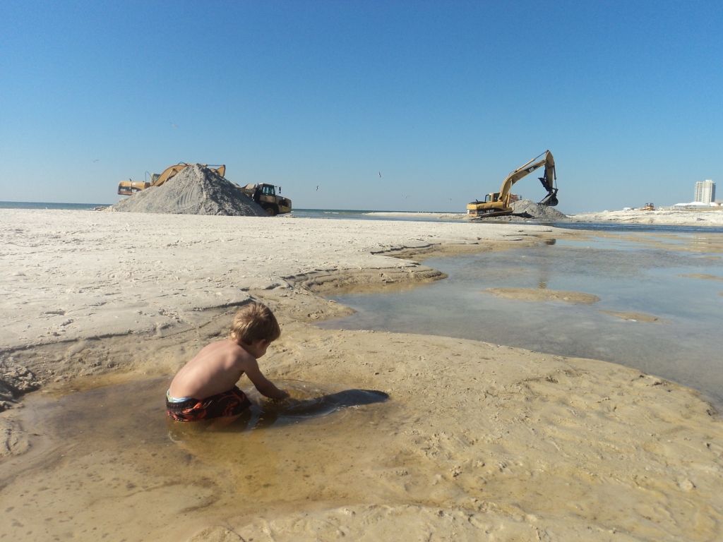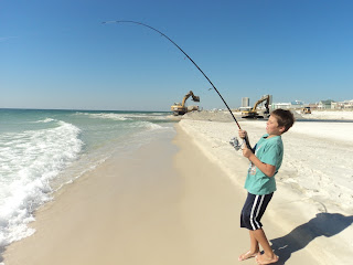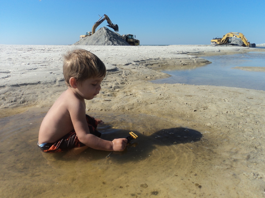 We headed to the little lagoon pass today just a couple miles west of Gulf Shores to do some exploring and fishing. They are doing some construction dredging work on the canal that leads to the Ocean and that is going to lead to some dynamite fishing! Here is Drake playing in his heaven! On the beach he either has a tractor in his hand or a live fish. Literally he carries around live fish and loves them, more on that later, for now the tractor: