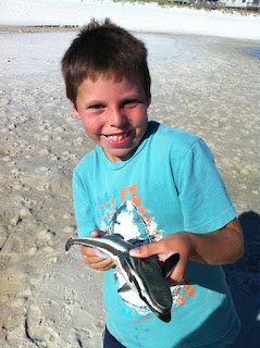 When we finally landed the fish, I found the other half of my hook lodged in its jaw, and Justin removed both of his hooks from its mouth! So anyhow while we were chasing sheepshead, the kids were playing on the beach and Drake was playing with his new best friend: