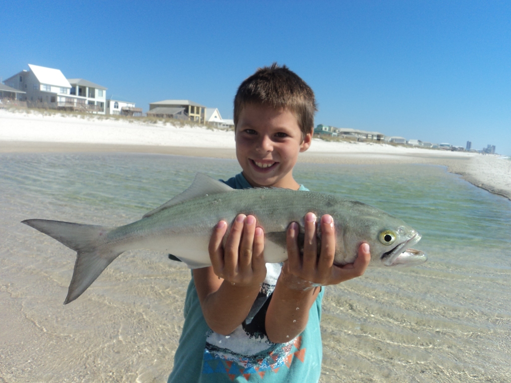 We catch a lot of trash fish like bluefish, ladyfish, remoras, lizardfish, pinfish, etc. We found this little isolated pond that fills up with water at high tide that we release our trash fish into. The kids LOVE it. Here is Tyden giving this bluefish a new home: