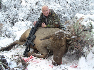 I didnt have nearly as much ground to cover as Jared, so I moved very slowly and sat up at the first real good elky looking spot. Wouldn't you know that 10 minutes later I turned to the right and there was a cow elk staring me down only about 100 yards away!!! We stared at each for what seemed like an eternity, but in reality was about 6-8 seconds. I didnt move a muscle, but she took off back into the thicket real quick.