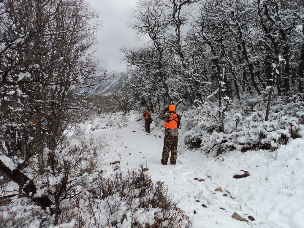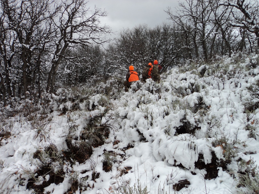 The snow was lightly falling and we quietly sneaked in about 1/4 mile to get into position on these elk. It was so cool to get in and set up, the setting was picture perfect! The elk were bedded down in a small clump of scrub oaks about 290 yards across a small crick valley. We were at the top of a ridge hiding in our own clump of scrub oaks.
