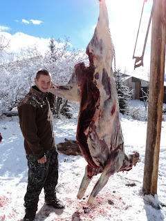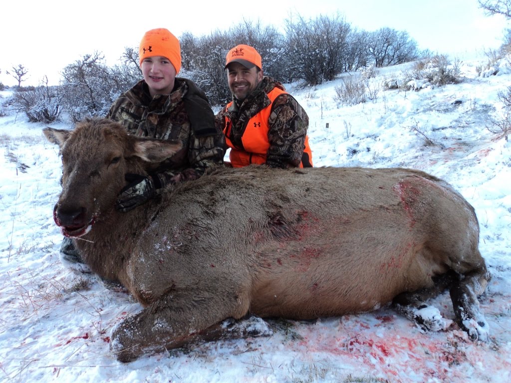 His first shot hit a little far back and while the cow was trotting away he put another shot in her hind quarters. His third shot missed and his 4th shot probably over 300 yards away put her down! Rand is 14 years old and this is his second elk hunt!!