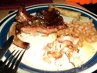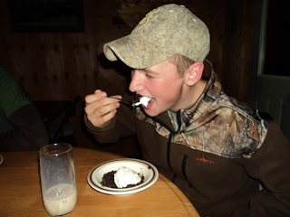 Dave picked me up at our meeting spot at dark and we headed into the lodge for some ribs and taters and finished er off with some chocolate cake!