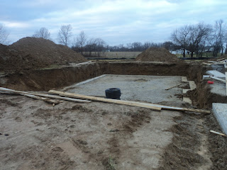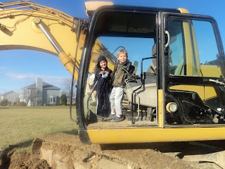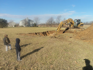 We got er done and got the footing tiles in and covered with pea gravel and now are hoping to pour basement walls at the end of this week! As bummed as I am about not having ice for fishing, I am pretty thankful for the mild weather for building this house. Here are some pics of the boys watching the basement get dug: