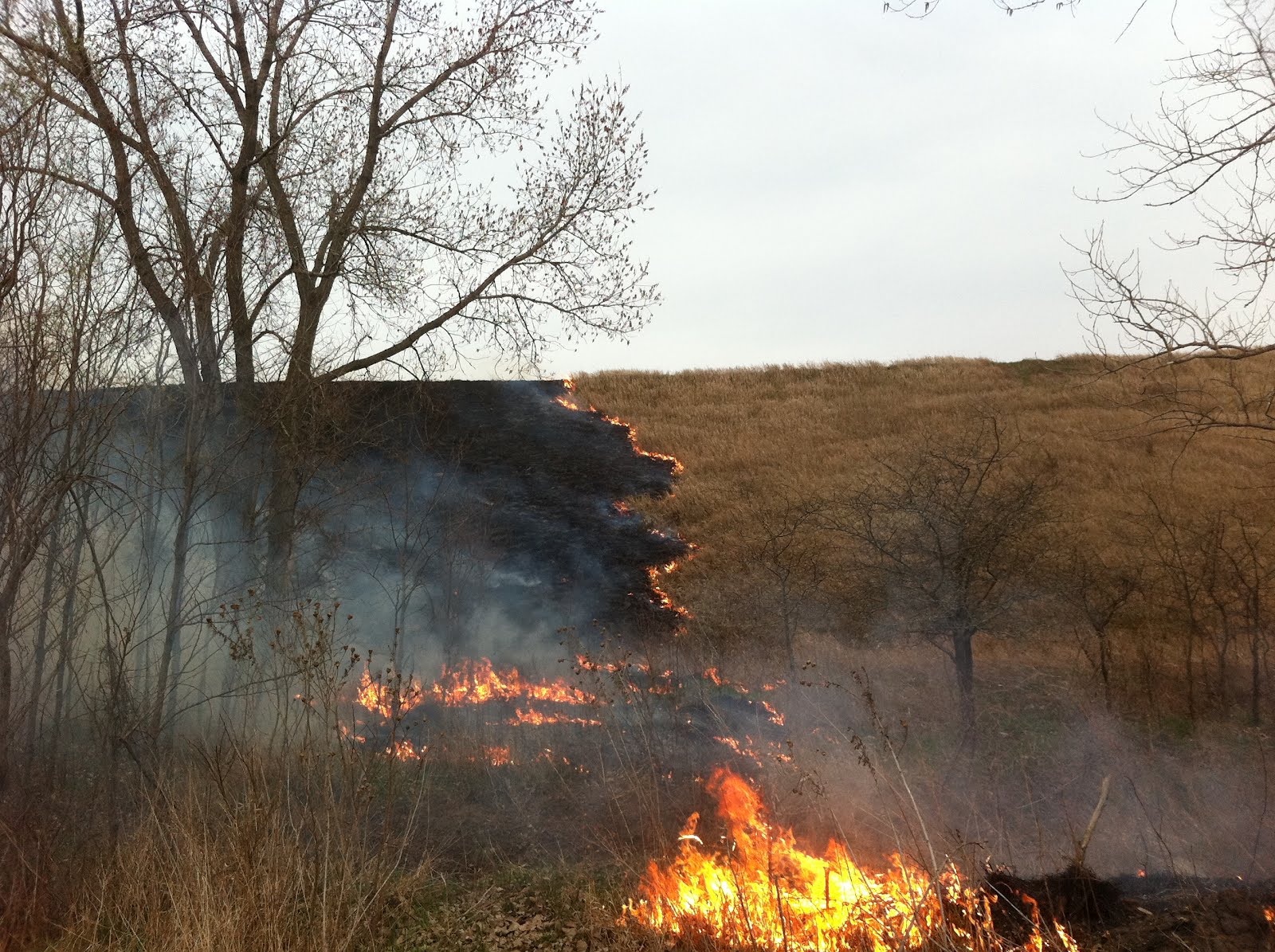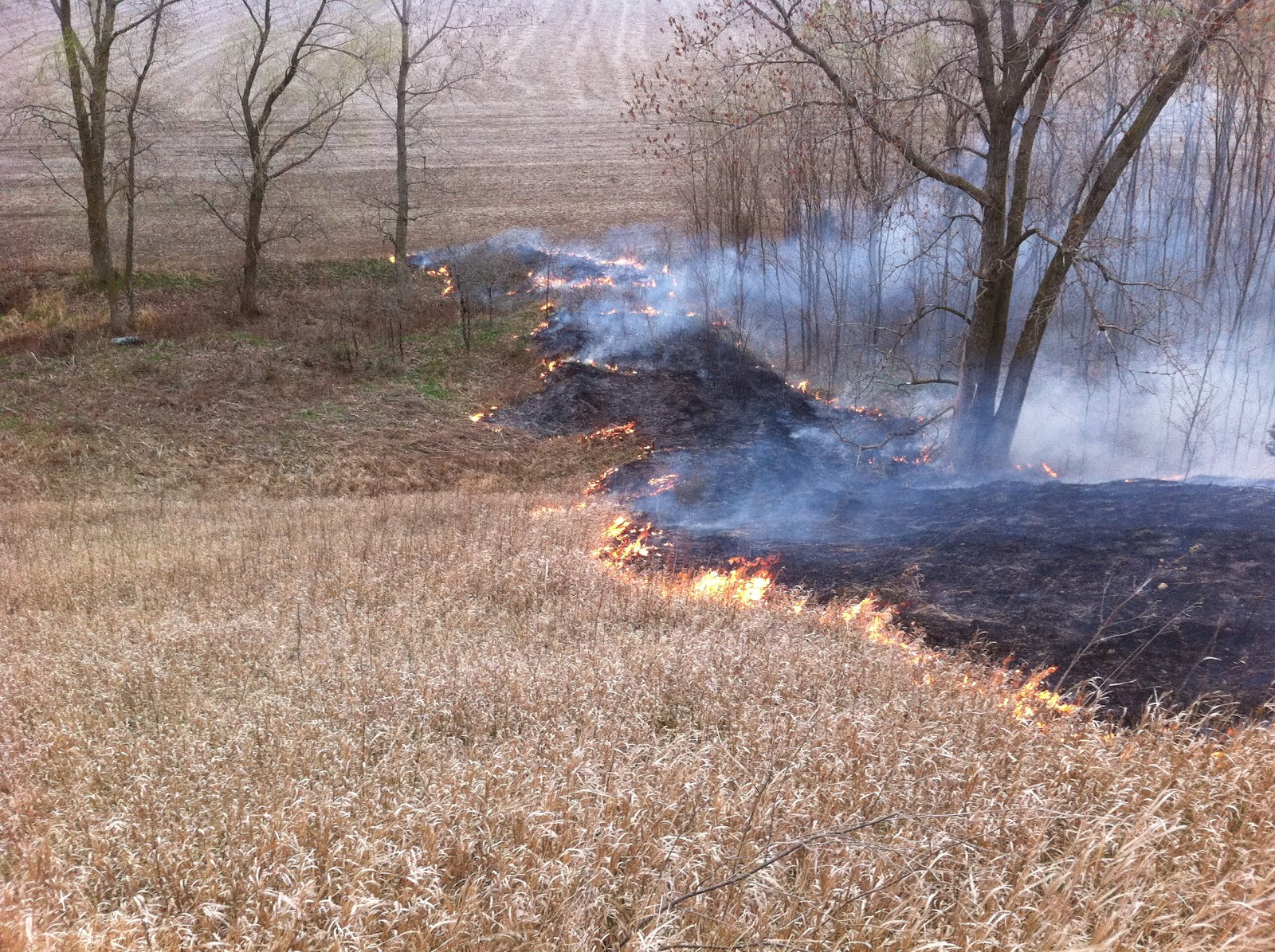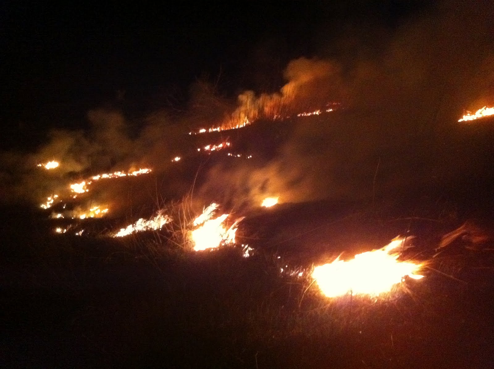 When done properly with lots of backburning, we actually use fire to put out the fires. Here is a pic of our first backburn going up the west hill. You can see the smoke and flames bending toward the north, but the fire actually moving to the south.