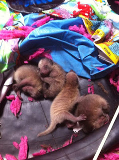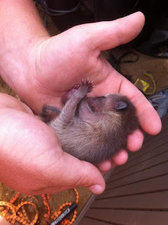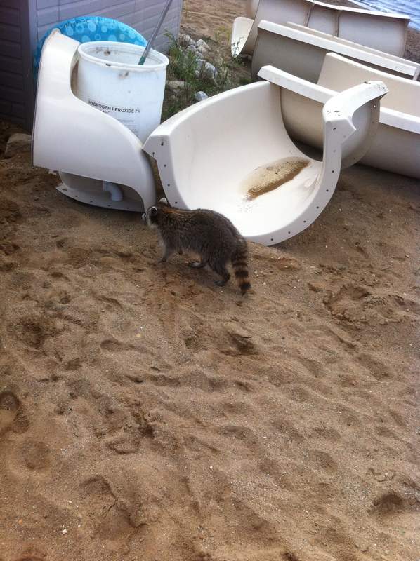 Oh yeah, we found a baby raccoon last spring and left food out for it at our barn all summer and winter. It was actually a pretty friendly raccoon all summer, but as winter progressed we saw less and less of her until this spring. Well, Tink had some babies last week and is not quite so friendly anymore. Her babies are sure cute though. We found them in our life jacket shed:
